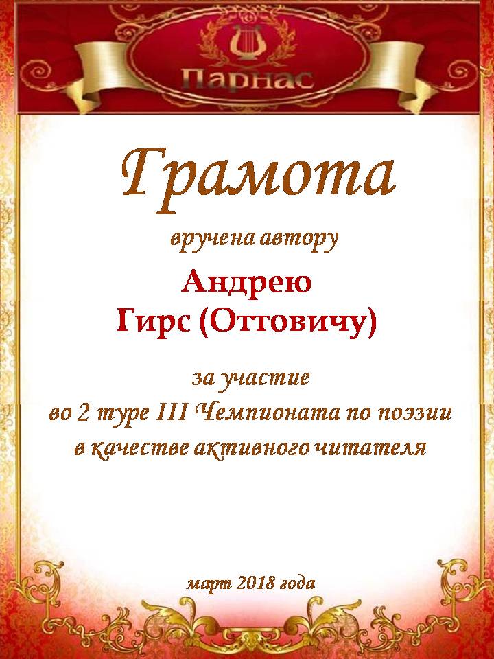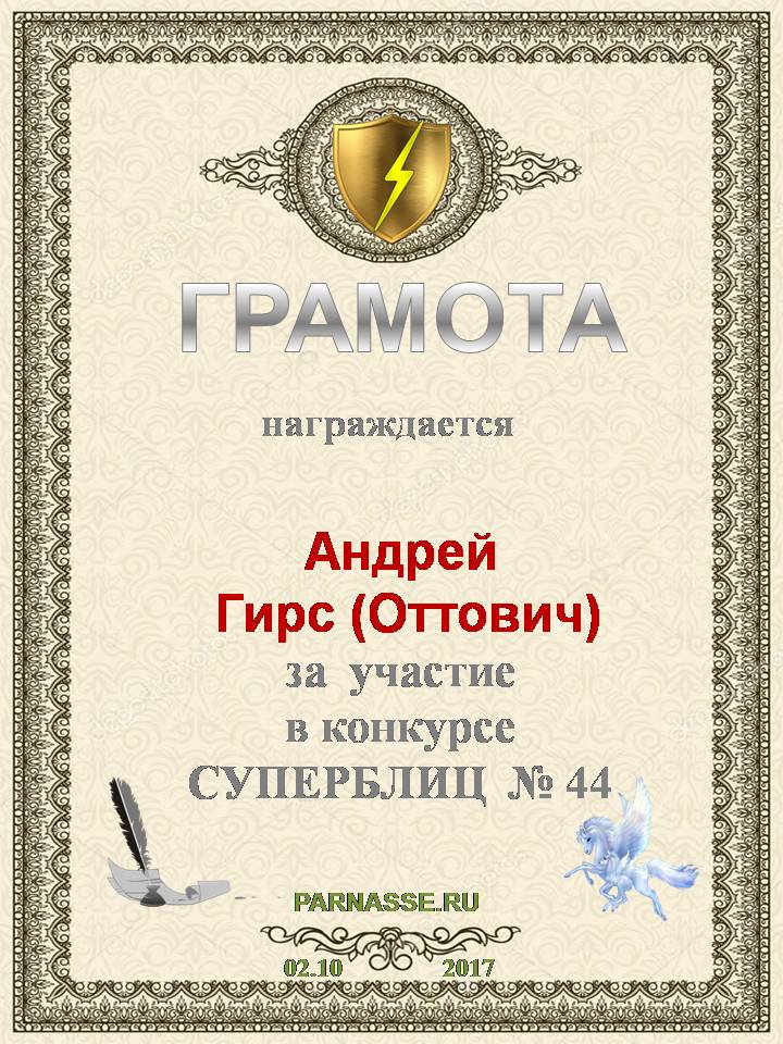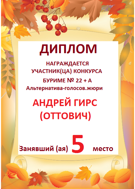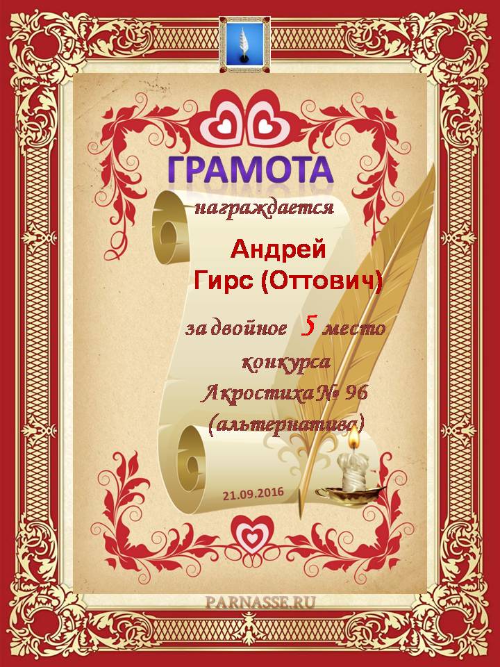 Грамота за двойное 5 место в 96 конкурсе АКРОСТИХА (Альтернатива)!