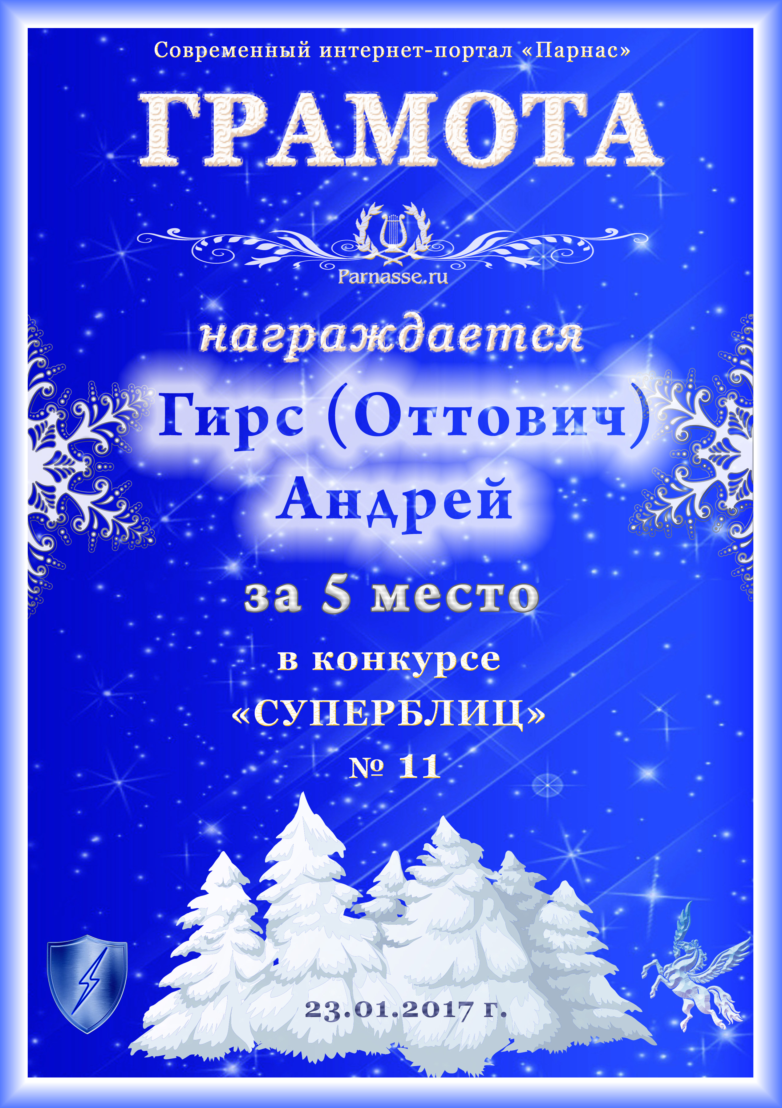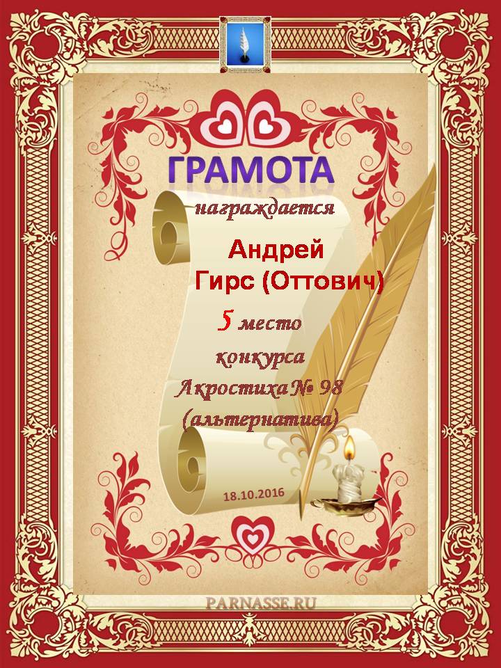 Грамота за 5 место в 98 конкурсе АКРОСТИХА (Альтернатива)!