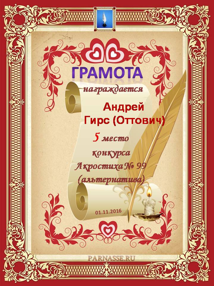 Грамота за 5 место в 99 конкурсе АКРОСТИХА (Альтернатива)!