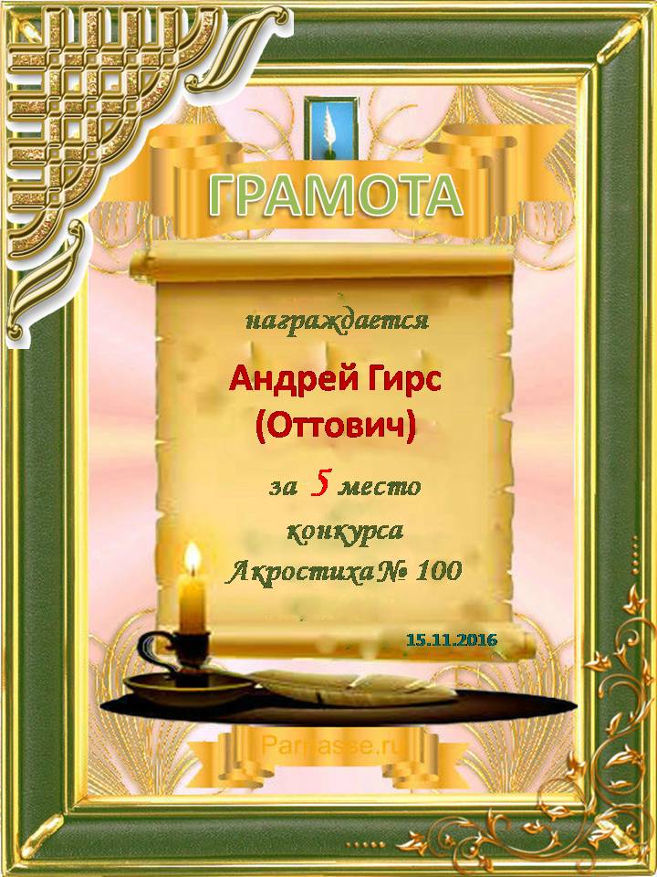 Грамота за 5 место в юбилейном конкурсе АКРОСТИХА № 100!