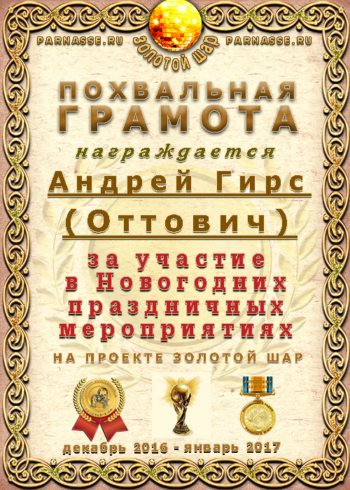 Похвальная Грамота за участие в Новогодних праздничных мероприятиях на проекте "ЗОЛОТОЙ ШАР"!