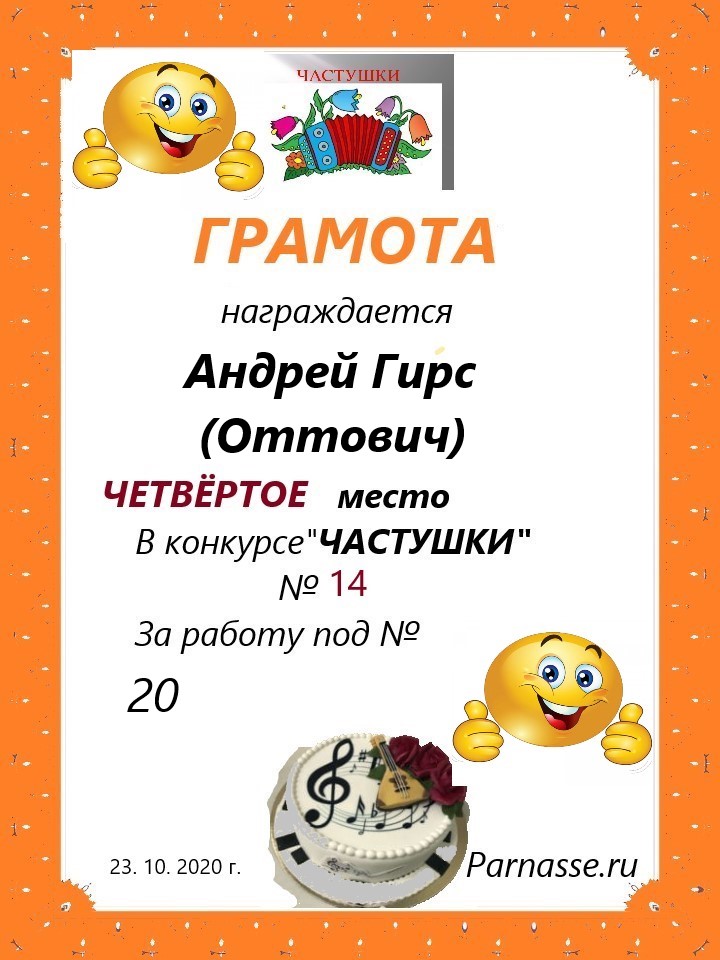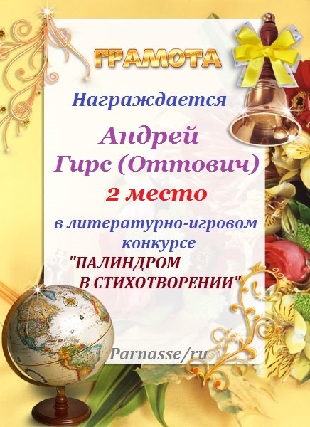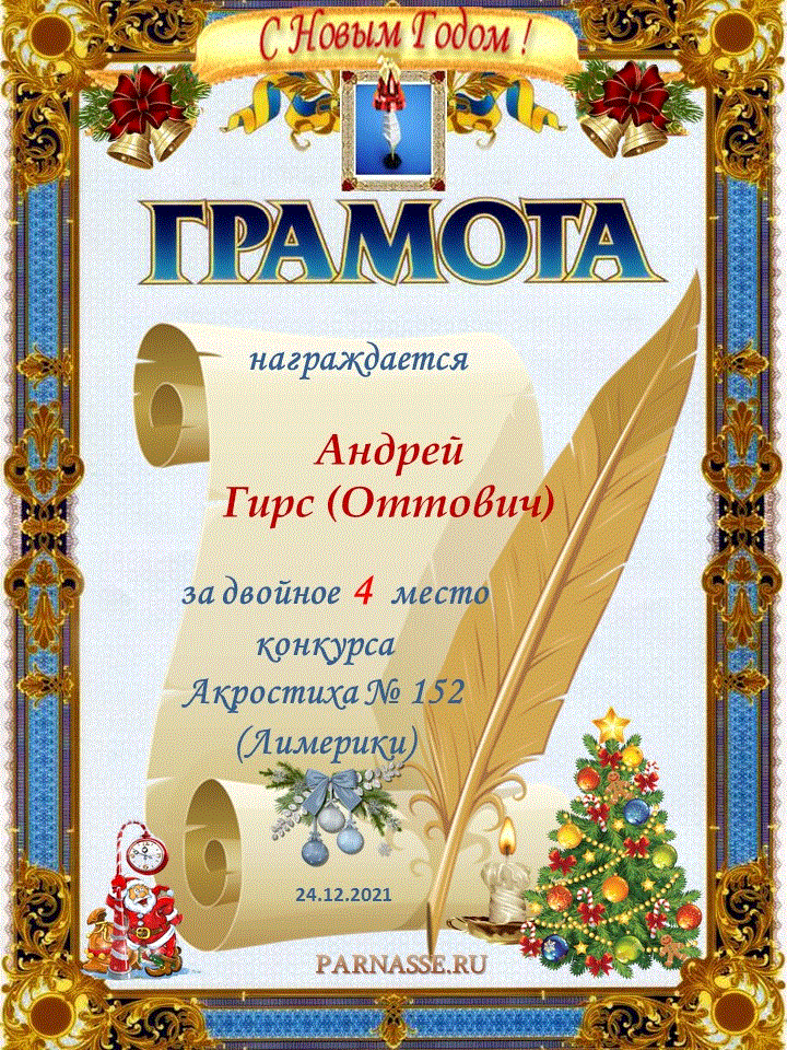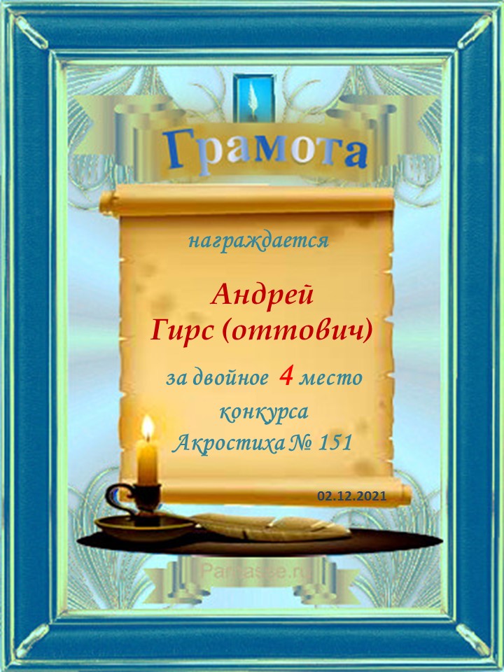 Грамота за 4 место в 102 конкурсе АКРОСТИХА!