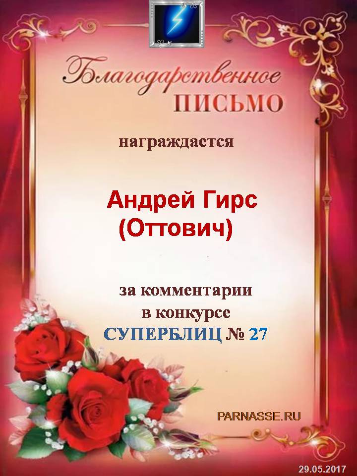 Похвальная грамота за активное участие в комментариях к конкурсу лимериков № 75+ (25.05.2016 г.)