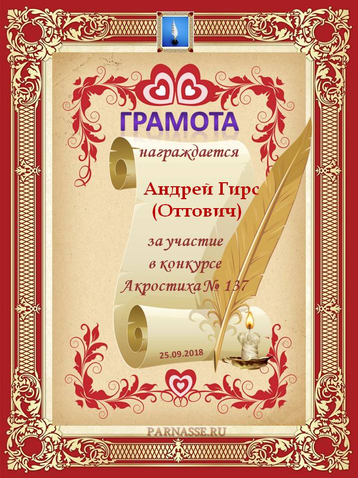Грамота за 4 место в 101 конкурсе АКРОСТИХА!