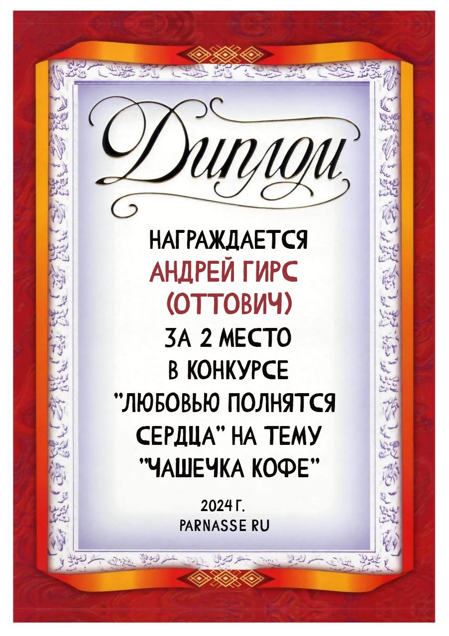 2 место в конкурсе "Любовью полнятся сердца" на тему "Чашечка кофе". Поздравляем!
