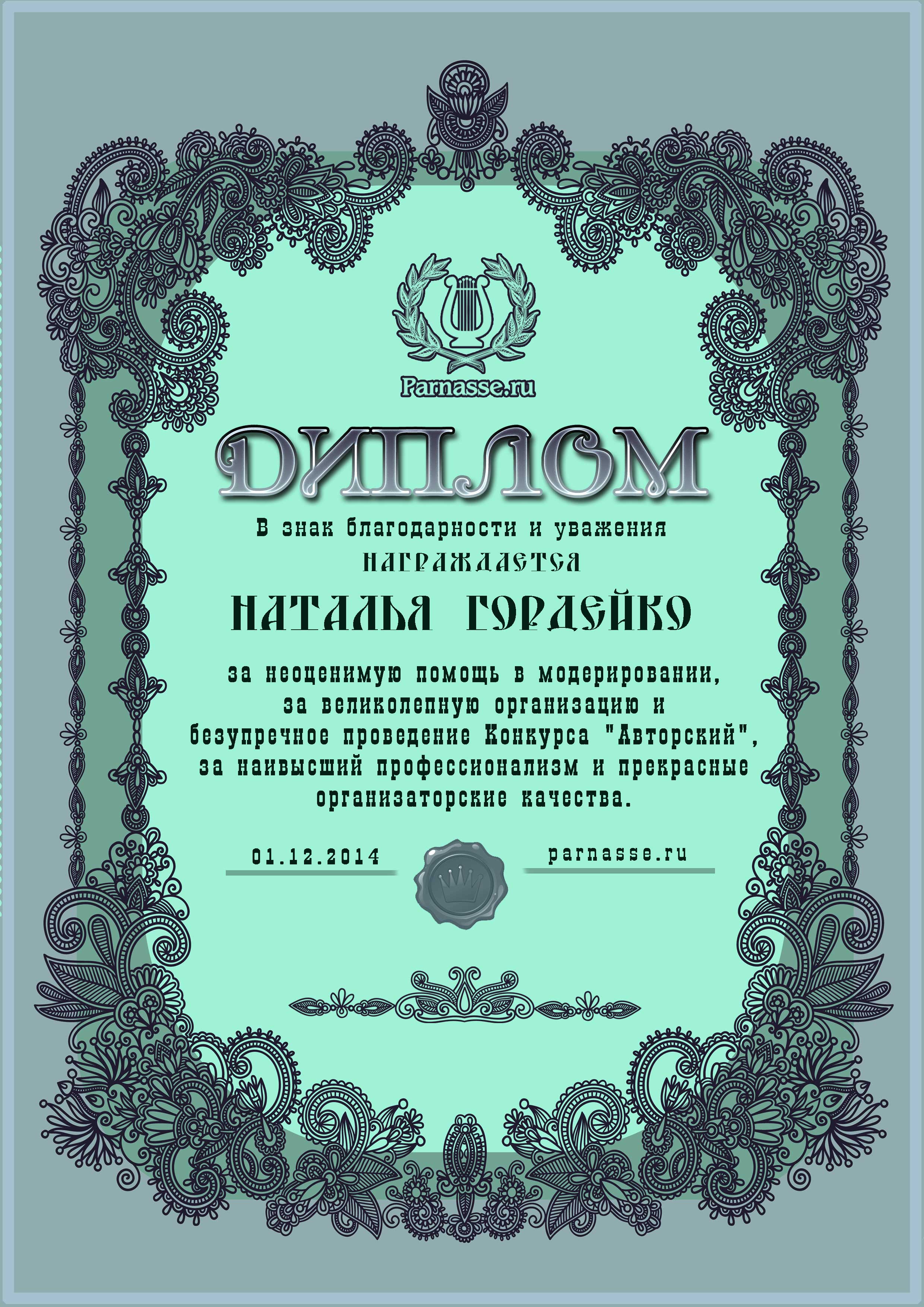 Уважаемая Наталия!Спасибо Вам большое за высокопрофессиональное, объективное судейство конкурсов на Парнасе!