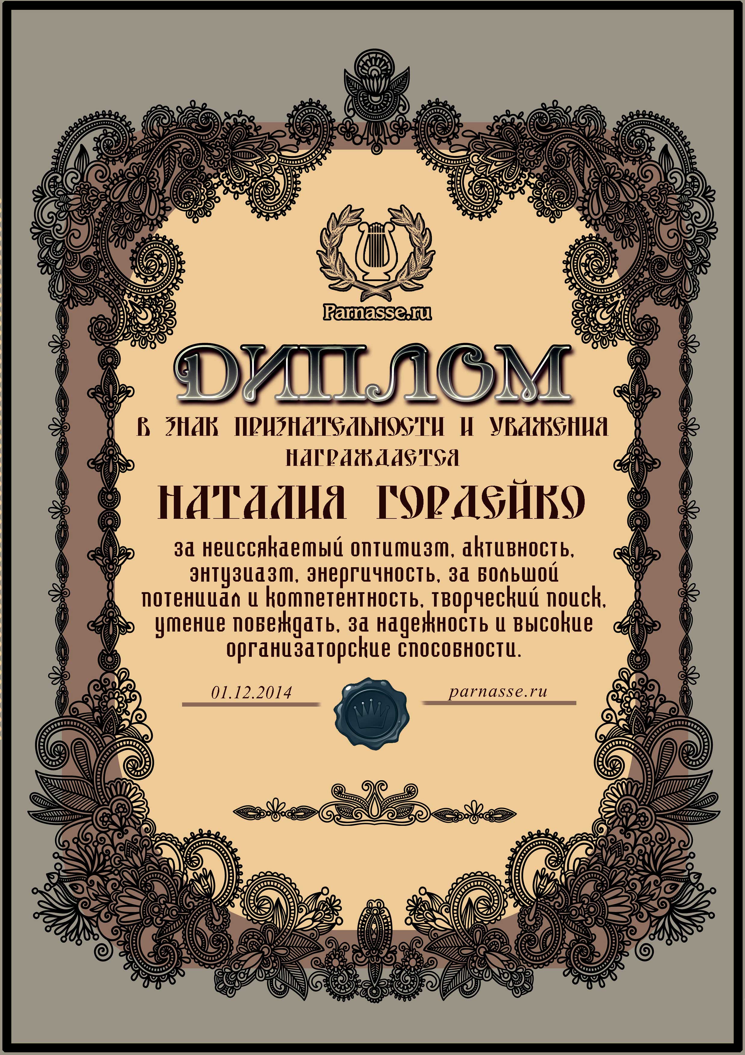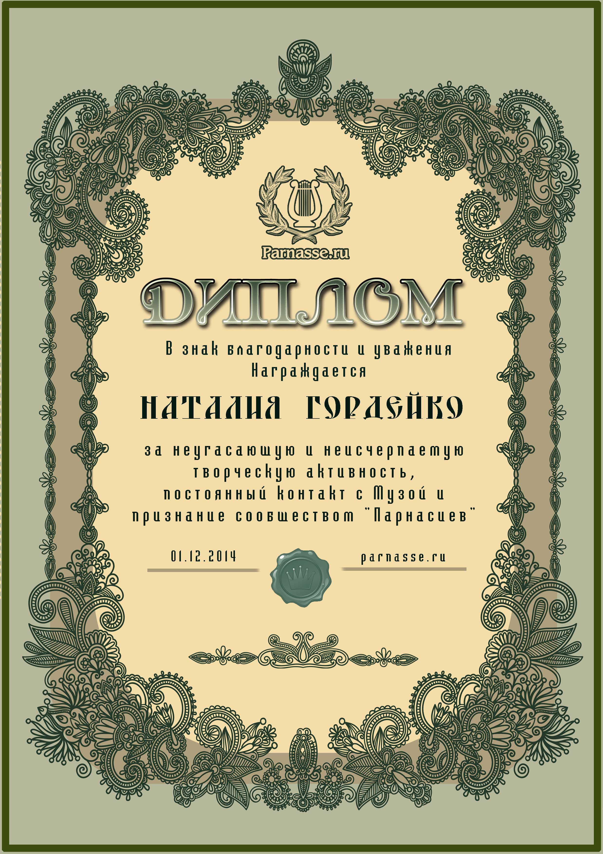 За неугасающую и неисчерпаемую творческую активность, постоянный контакт с Музой и признание сообществом "Парнасцев".От всей души желаем Вам, Наталия, здоровья, любви, успехов, благополучия, удачи и творческого вдохновения!