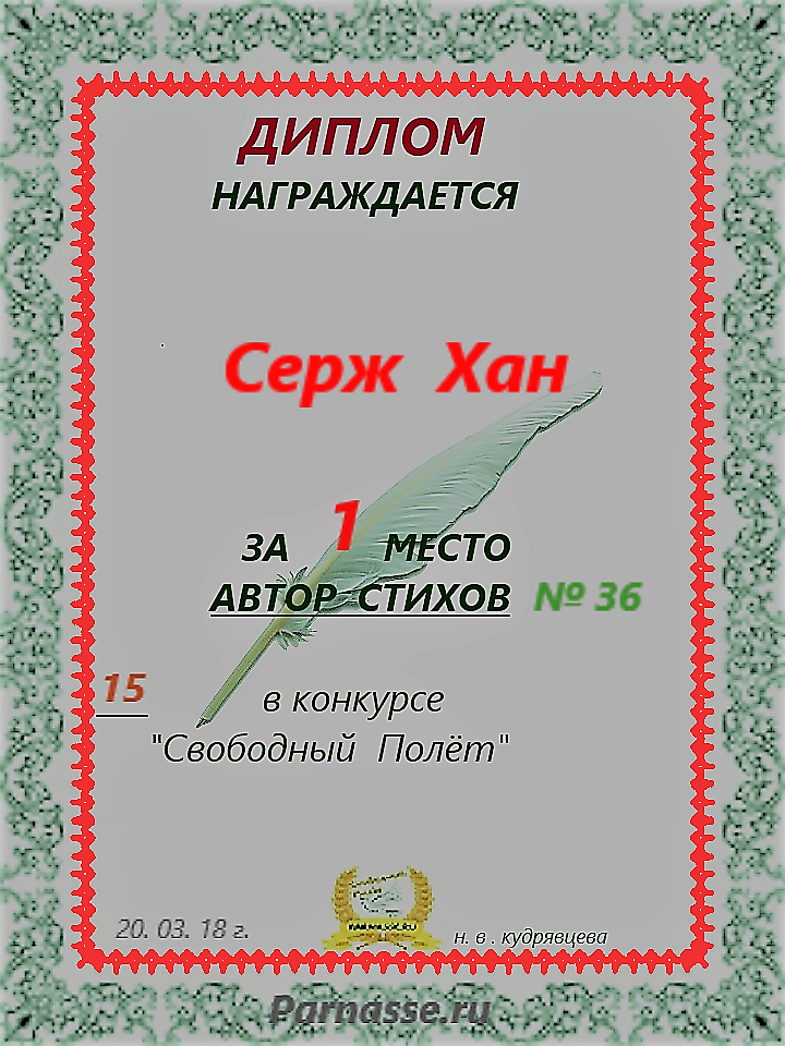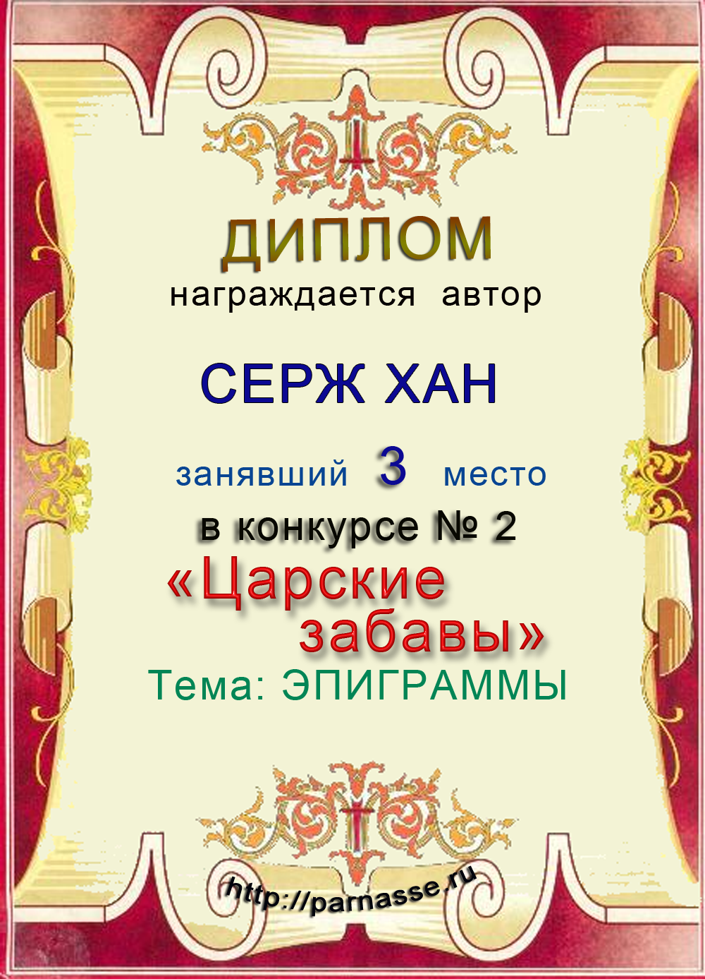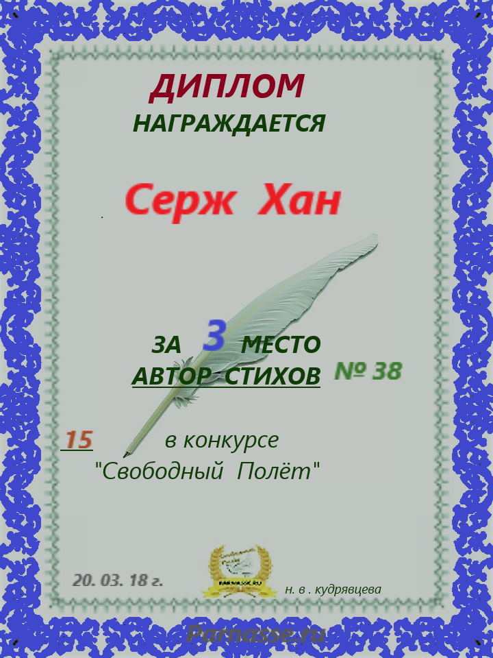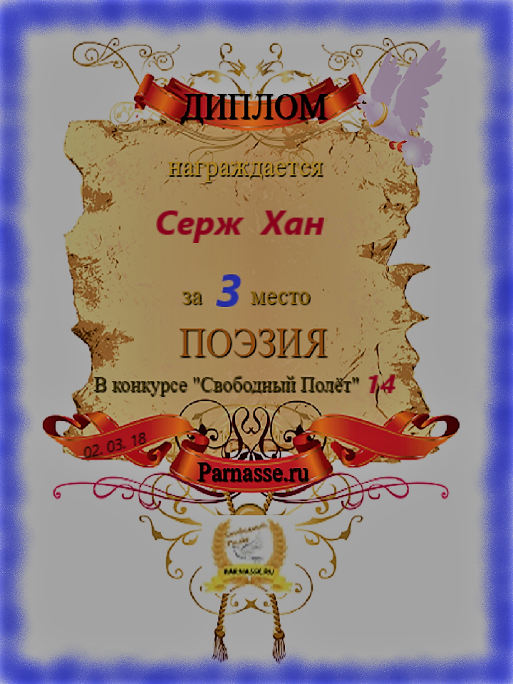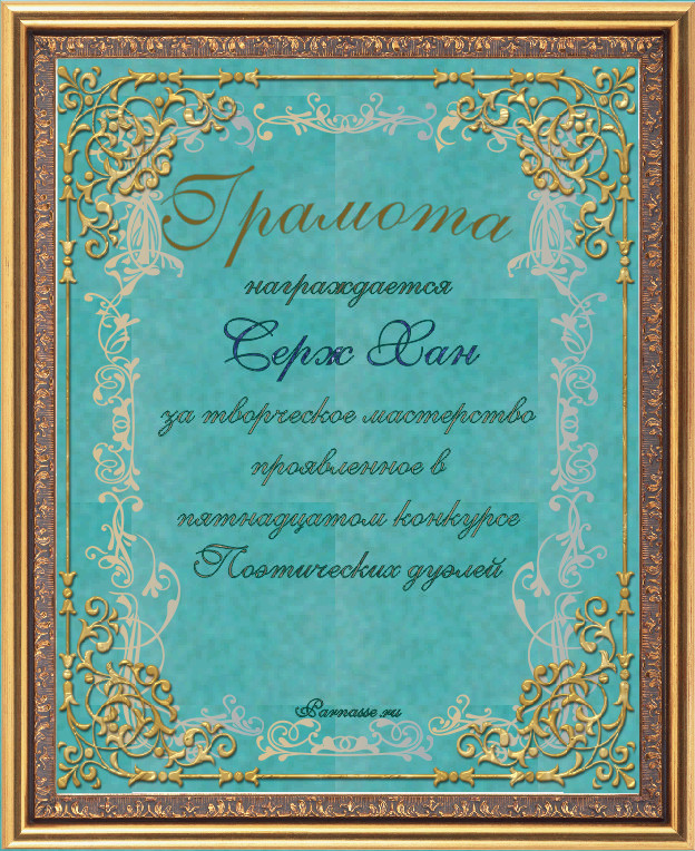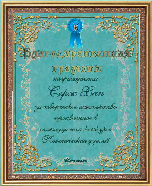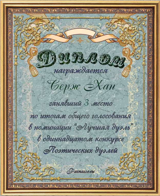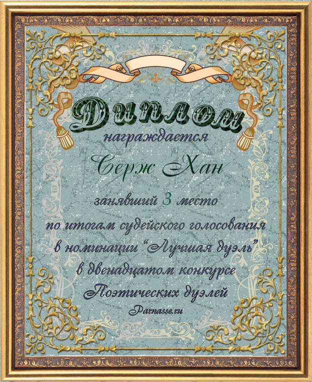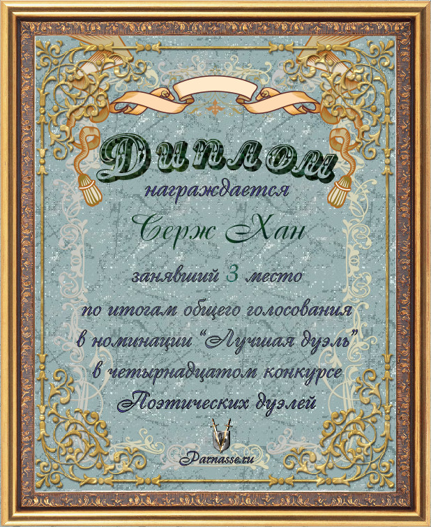 Диплом за 3-е место в номинации "ЛУЧШАЯ ДУЭЛЬ" по итогам общего голосования в 14ом конкурсе поэтических дуэлей (№ 9.2)