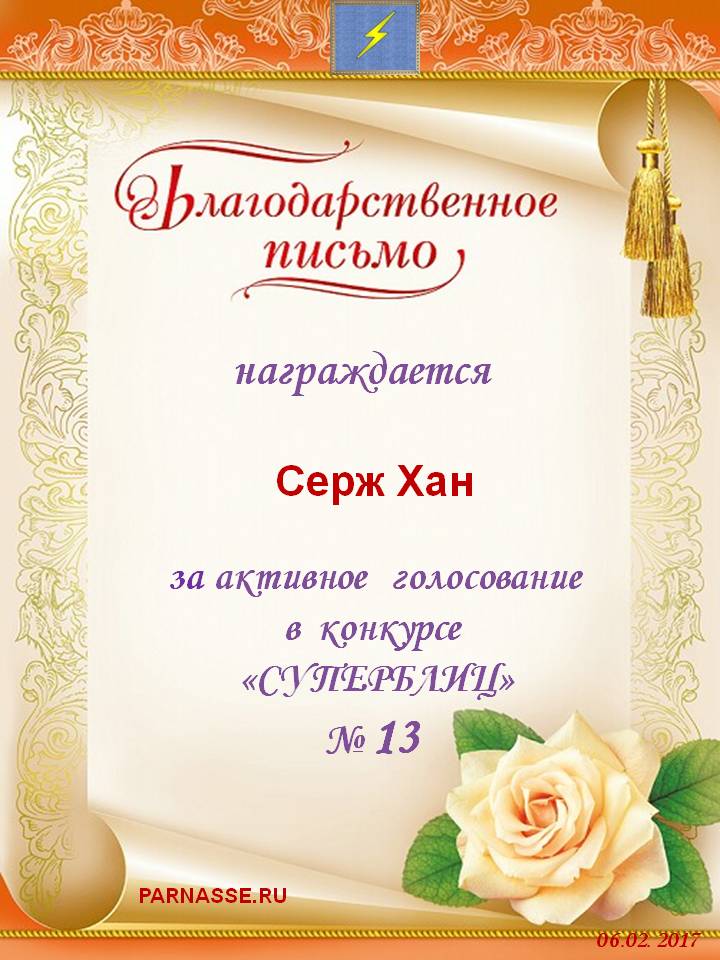Благодарность за активное голосование в 13 конкурсе СУПЕРБЛИЦА!СПАСИБО БОЛЬШОЕ!