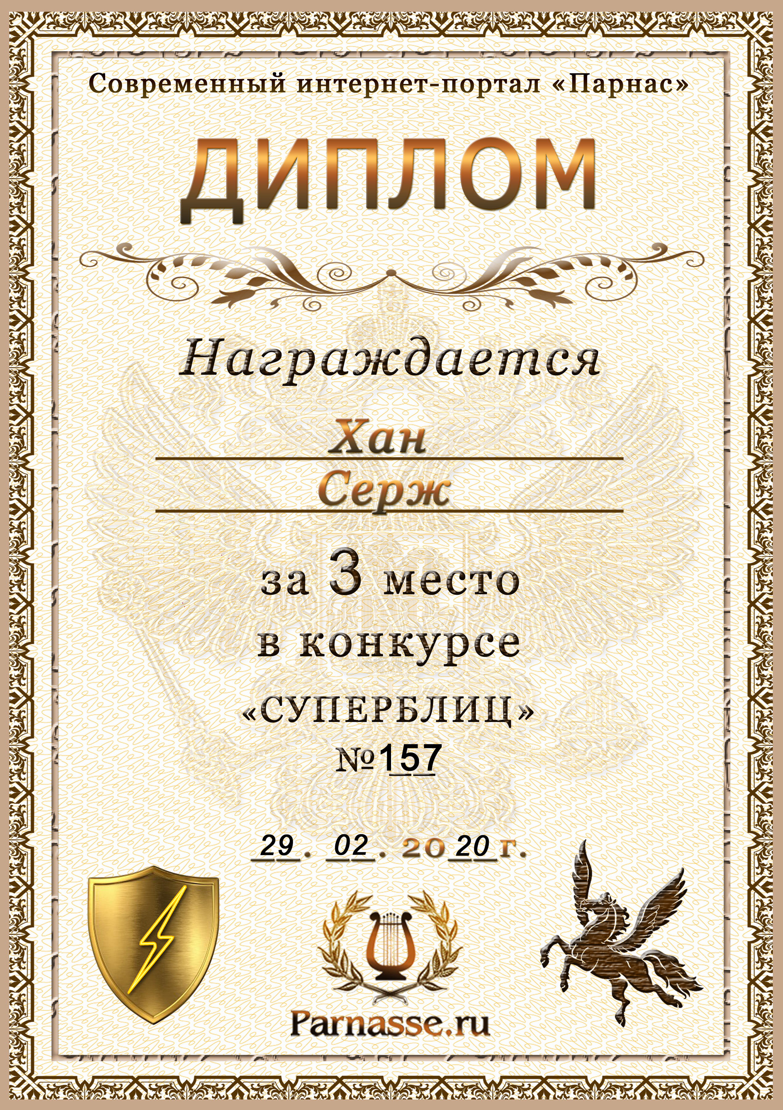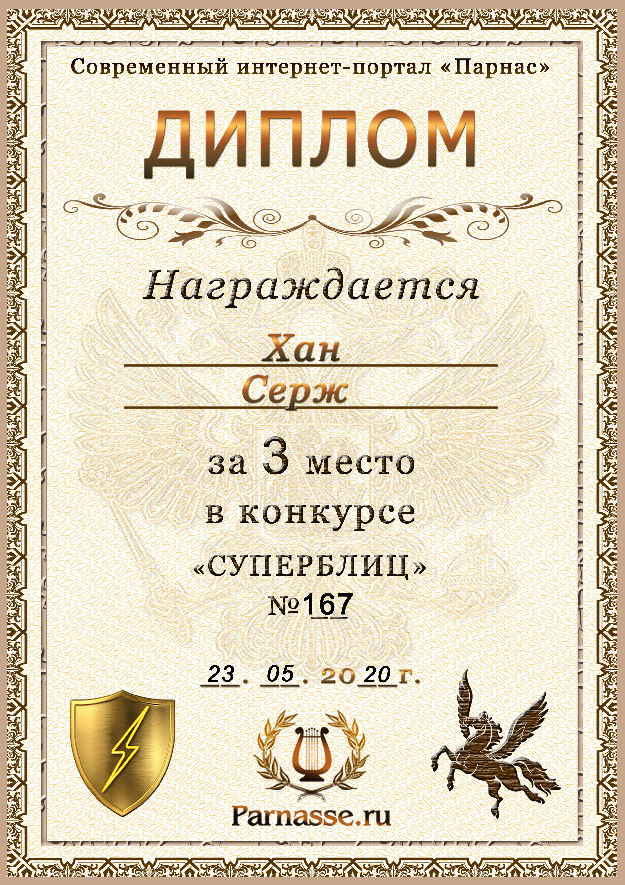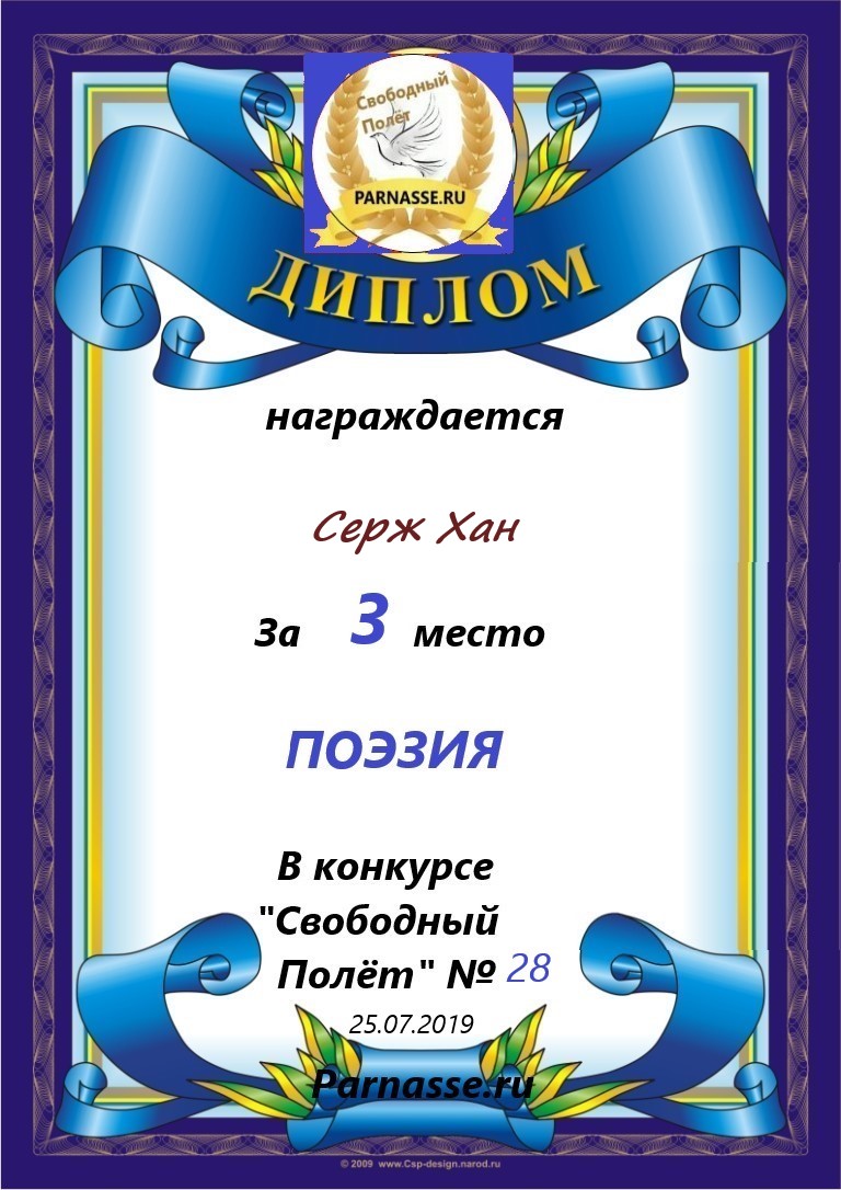 Диплом за 3-е место в номинации "ЛУЧШАЯ ДУЭЛЬ" по итогам судейского голосования в 12м конкурсе поэтических дуэлей (№ 19.2)