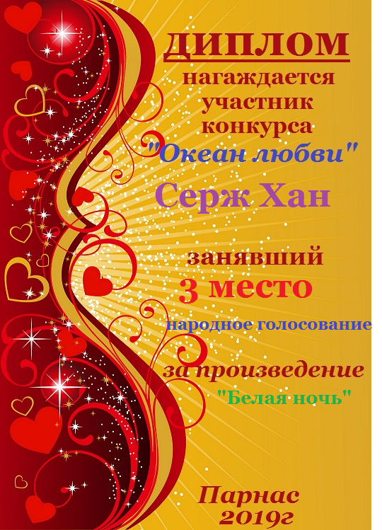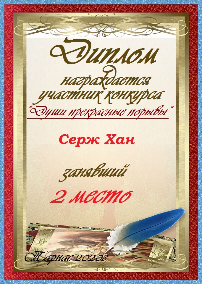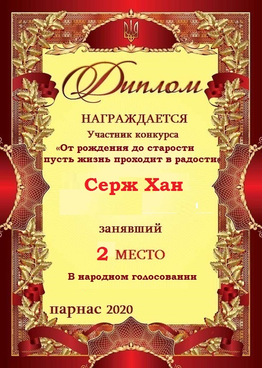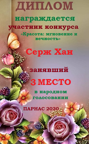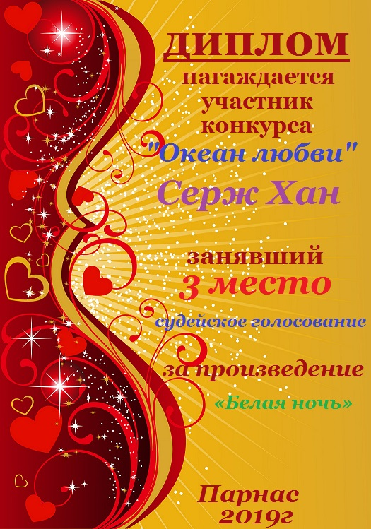 Серж,поздравляем с занятым 2 местом в номинации Стихи о море "О, море-море, ты красиво!" - судейское голосование! Желаем новых творческих побед!