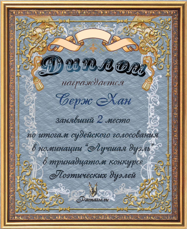 Диплом за 2-е место в номинации "ЛУЧШАЯ ДУЭЛЬ" по итогам судейского голосования в 13м конкурсе поэтических дуэлей (№ 11.1)