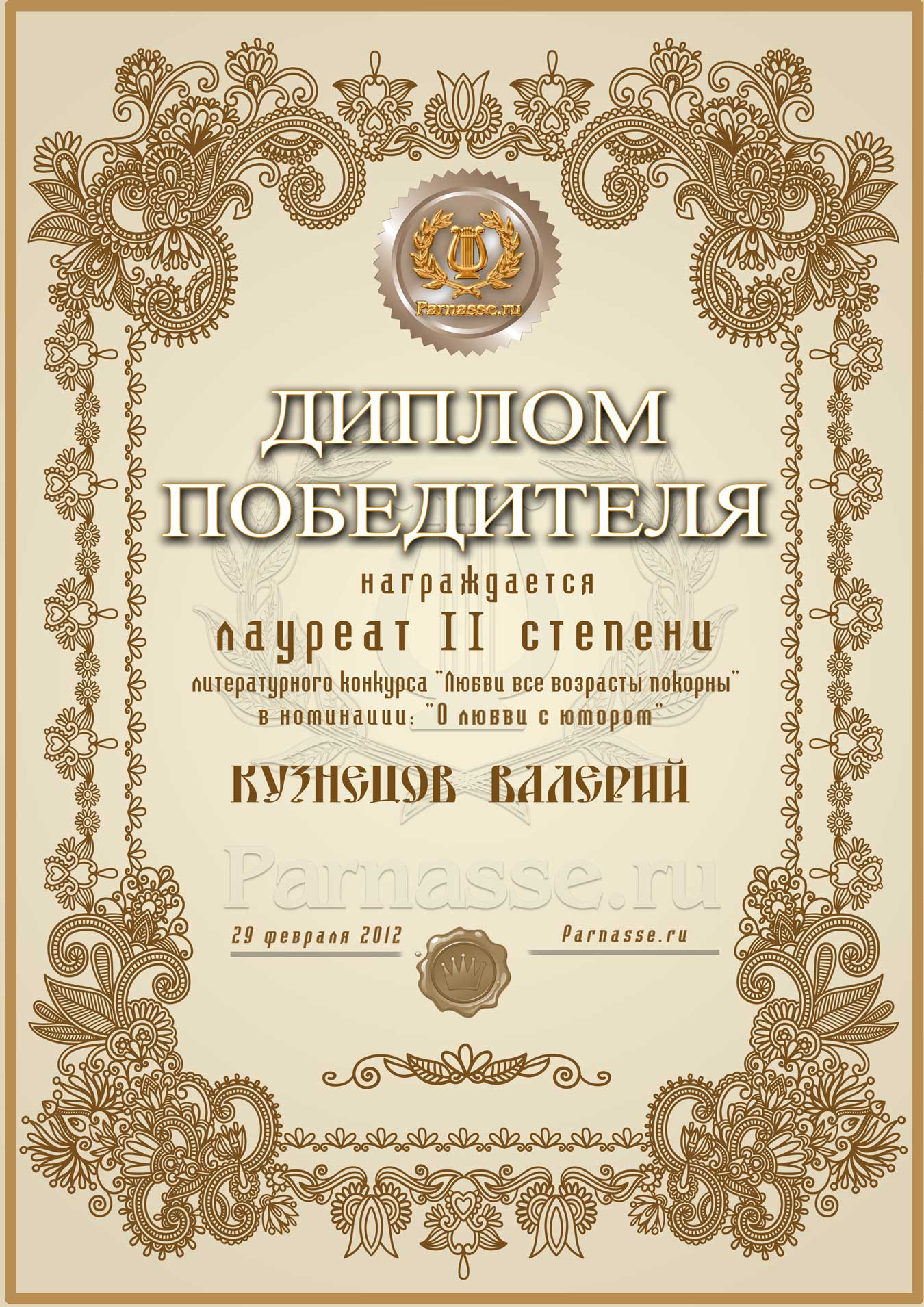 За 2 место в конкурсе «Любви все возрасты покорны» согласно голосованию членов жюри - редакторов сайта.Номинация «О любви с юмором»