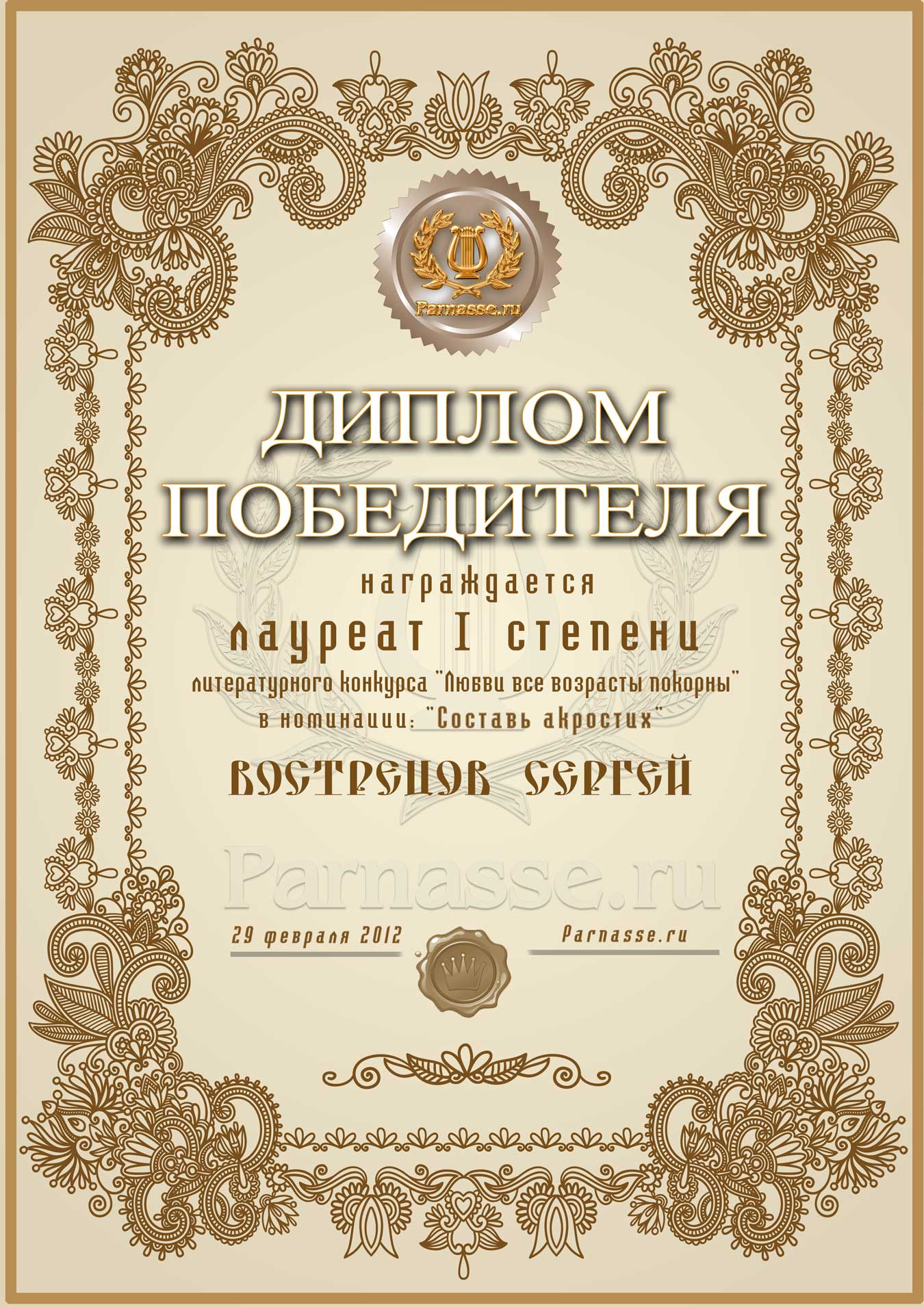 Диплом лауреата II степени сетевого лит. конкурса "Любви все возрасты покорны" в номинации "Красивые признания в любви", редакторское голосование.