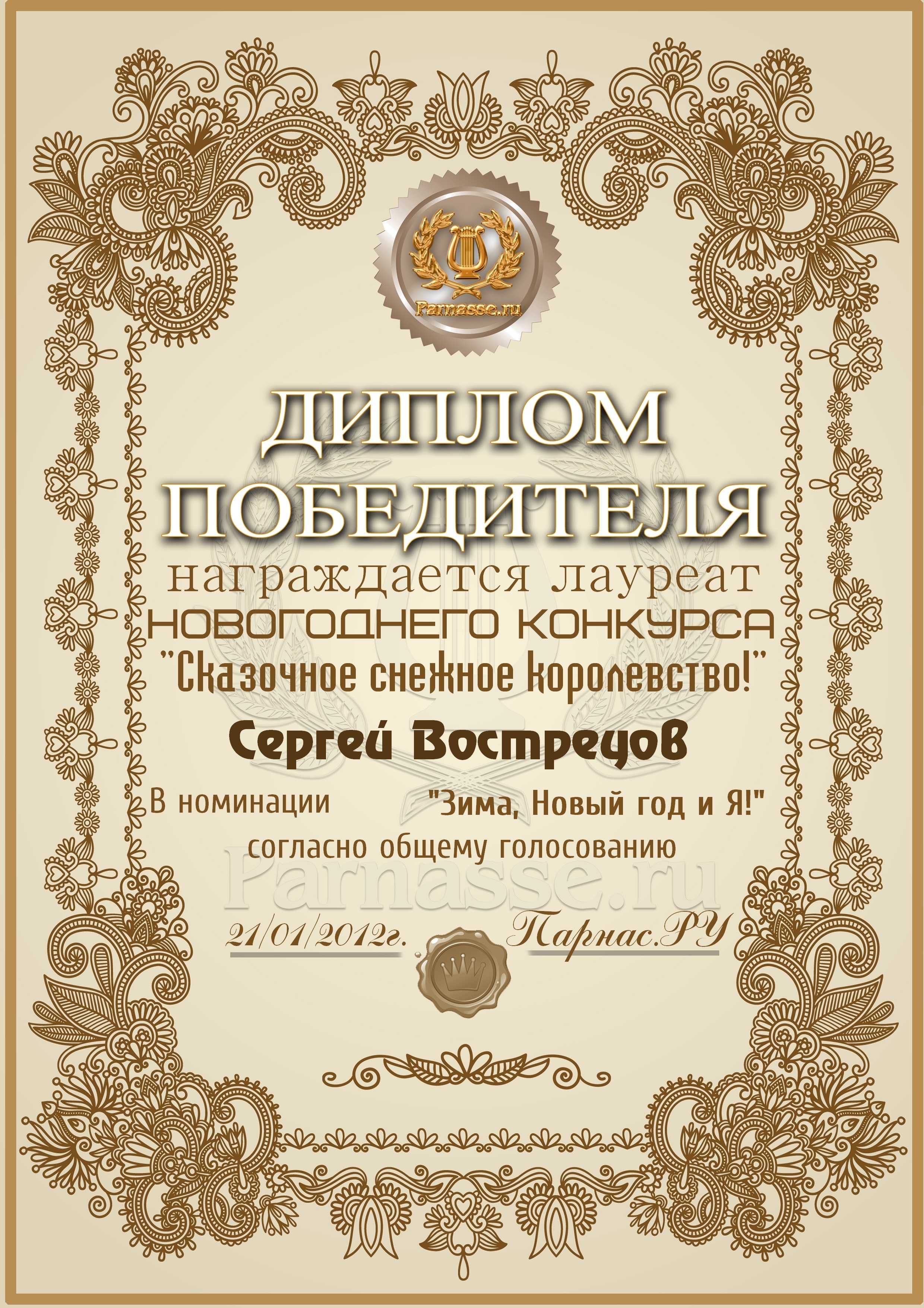 От лица Администрации творческого портала "Парнас" вручаем Вам этот памятный знак с самыми наилучшими пожеланиями! Пусть Вас весь год не покидает творческий запал, удача, а здоровье будет столь же крепким и нерушимым, как и традиция Новогоднего праздника! Счастья, успехов и любви Вам и Вашей семье, друзьям и близким!