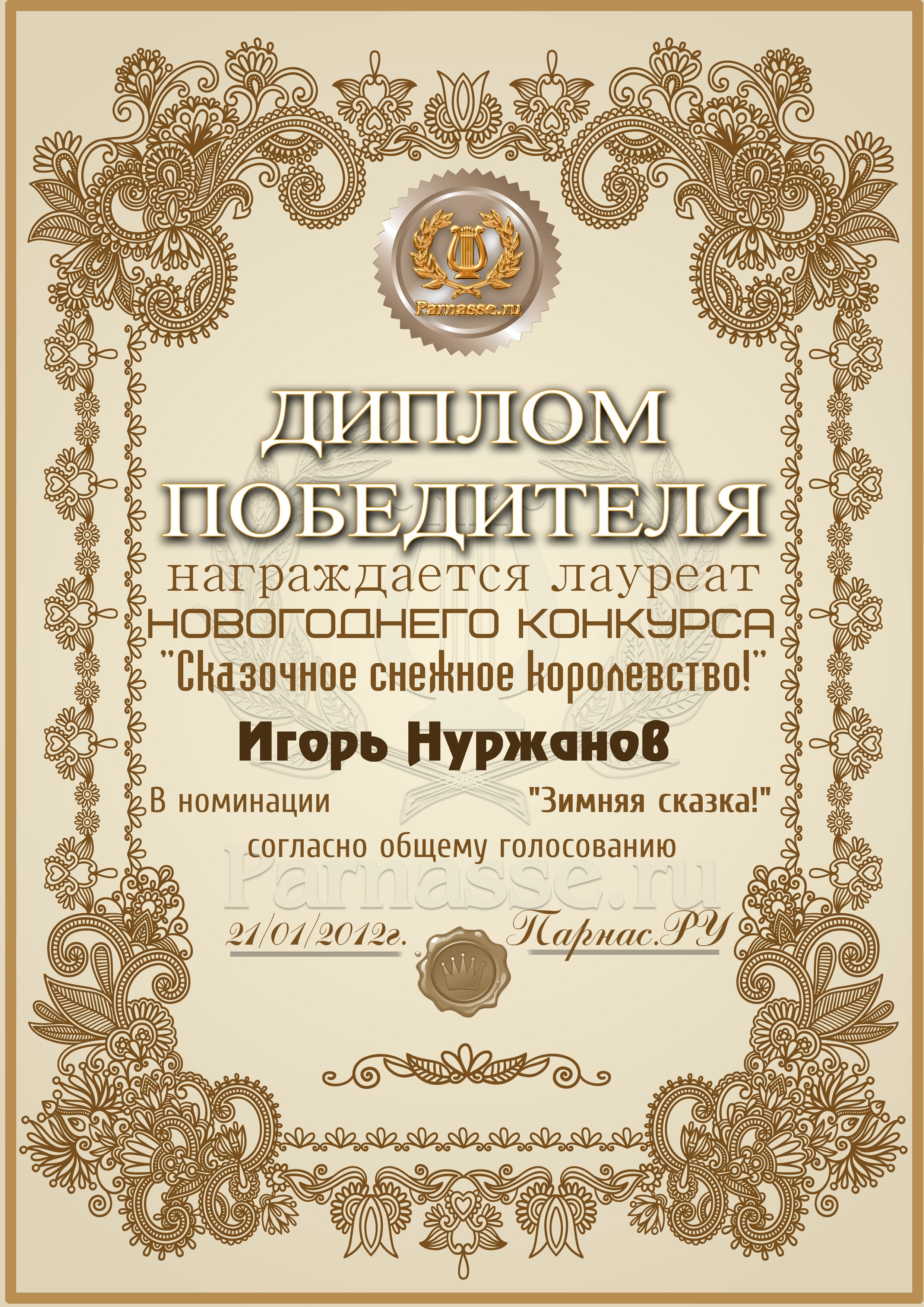 Лауреату новогоднего конкурса "Сказочное снежное королевство!" за первое место в номинации "Зимняя сказка!" согласно общему голосованию.