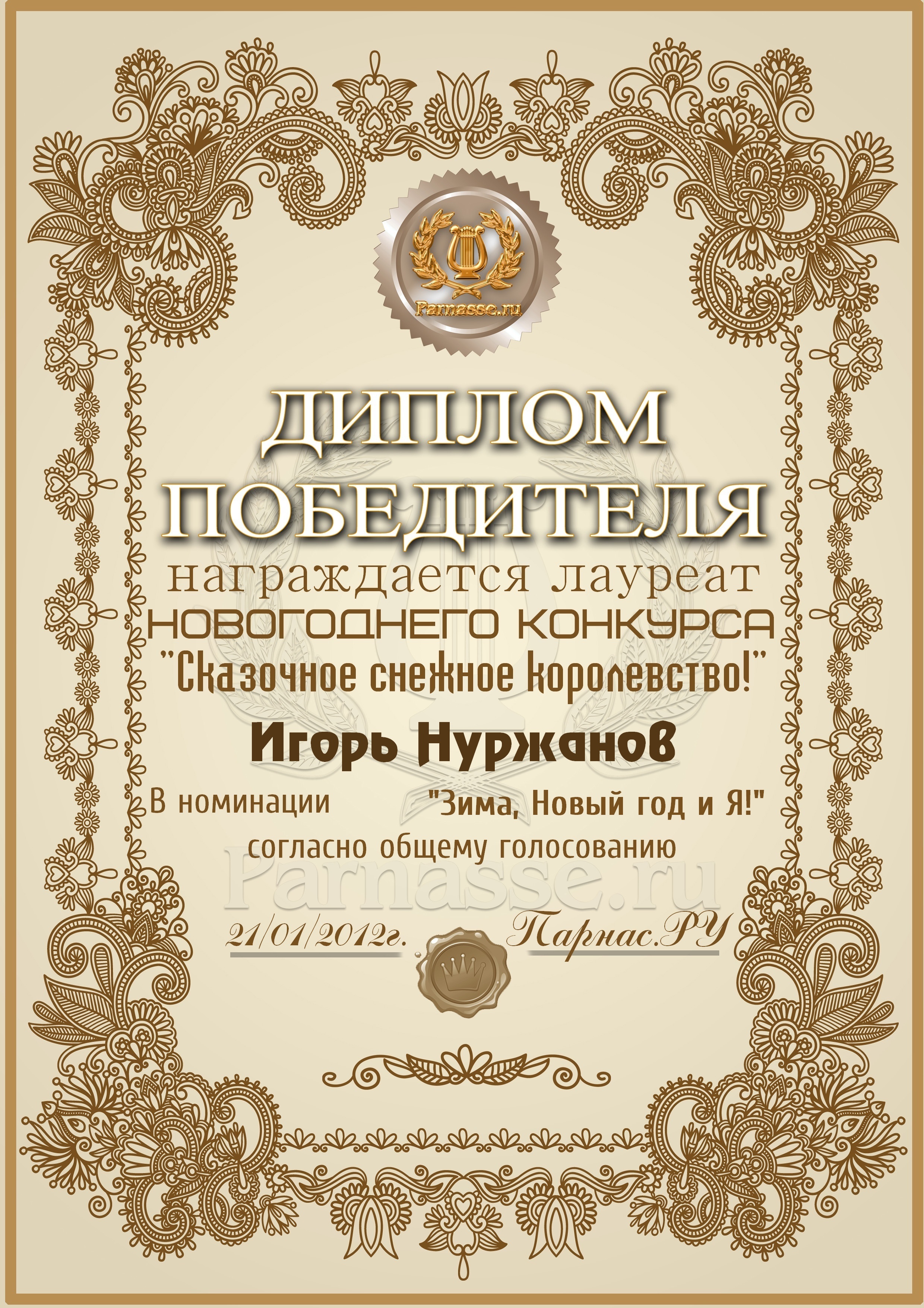 Лауреату новогоднего конкурса "Сказочное снежное королевство!" за первое место в номинации "Зима, Новый год и Я!" согласно общему голосованию.
