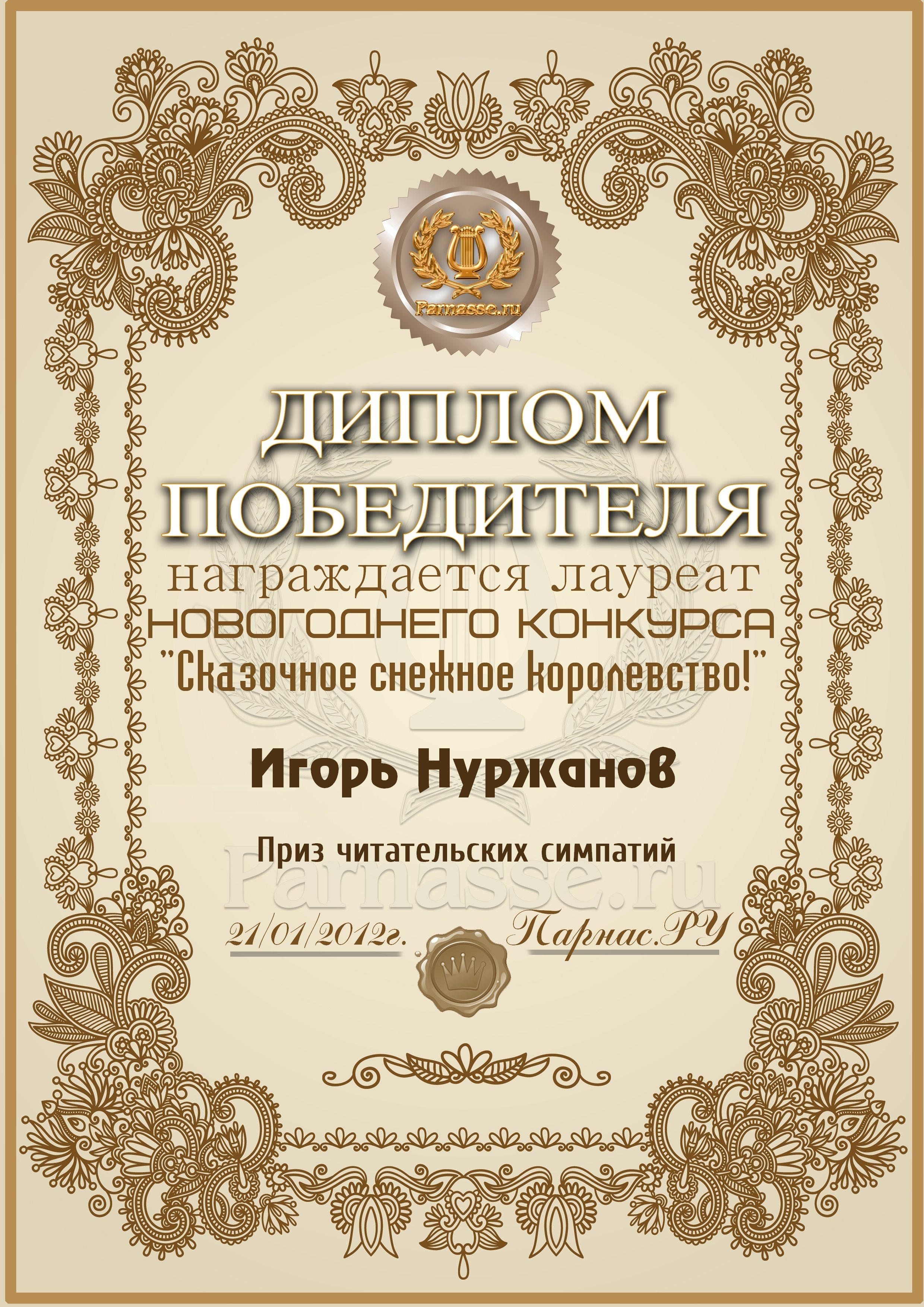 Лауреату новогоднего конкурса "Сказочное снежное королевство!" за первое место в номинации "Приз читательских симпатий" согласно общему голосованию.