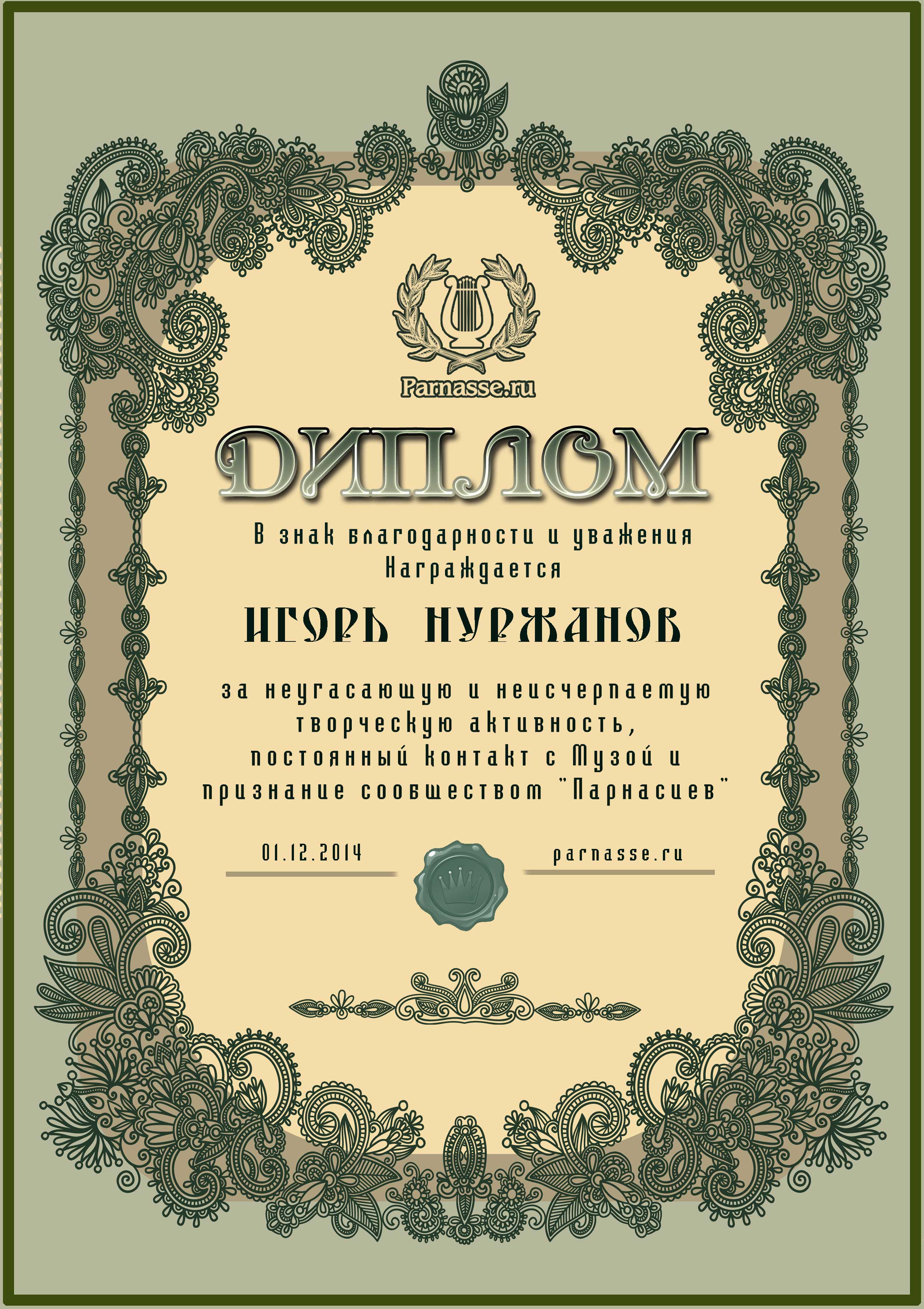 За неугасающую и неисчерпаемую творческую активность, постоянный контакт с Музой и признание сообществом "Парнасцев".