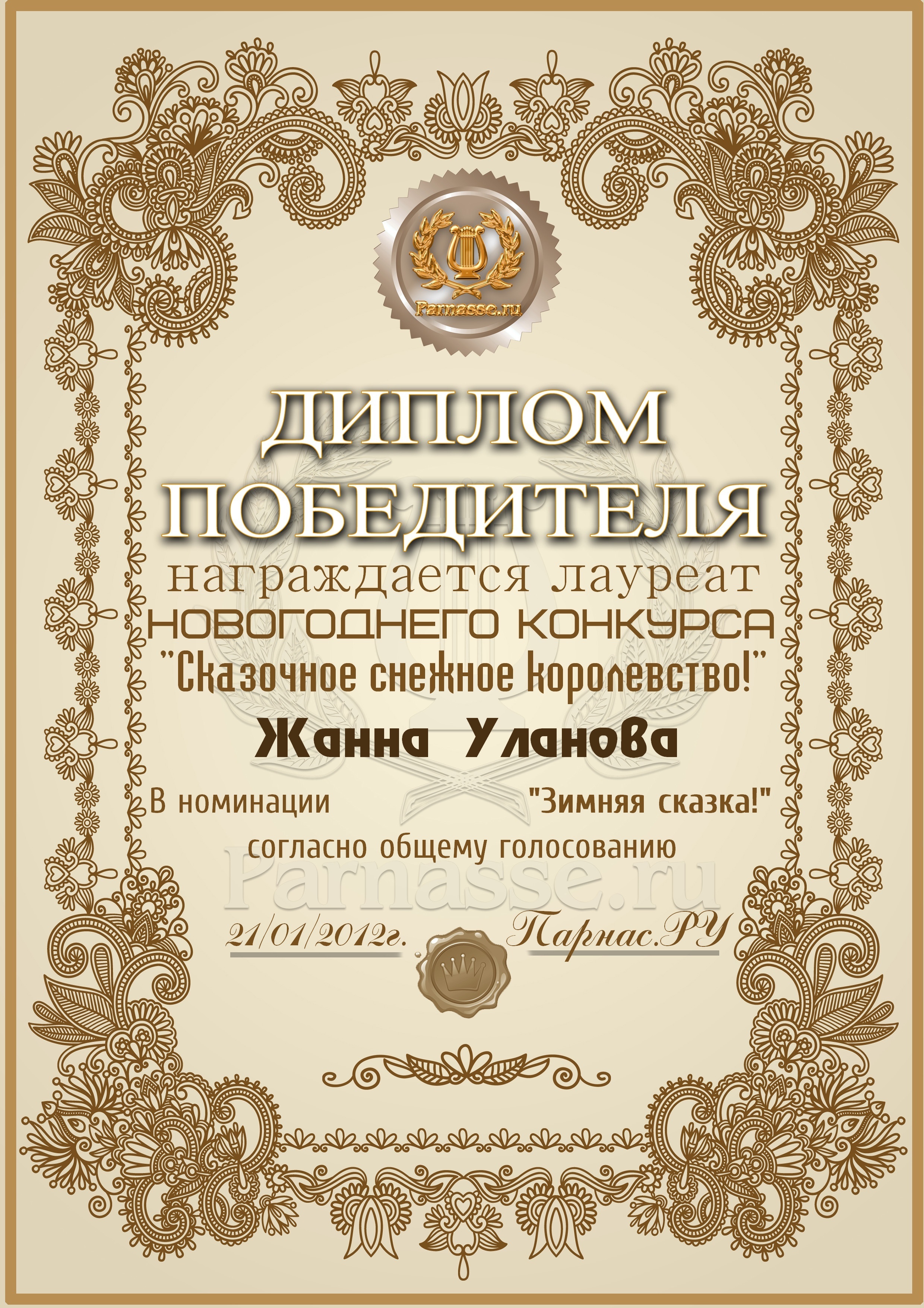 Лауреату новогоднего конкурса "Сказочное снежное королевство!" за первое место в номинации "Зима, Новый год и Я!" согласно общему голосованию.Произведение «Новогодняя ночь».