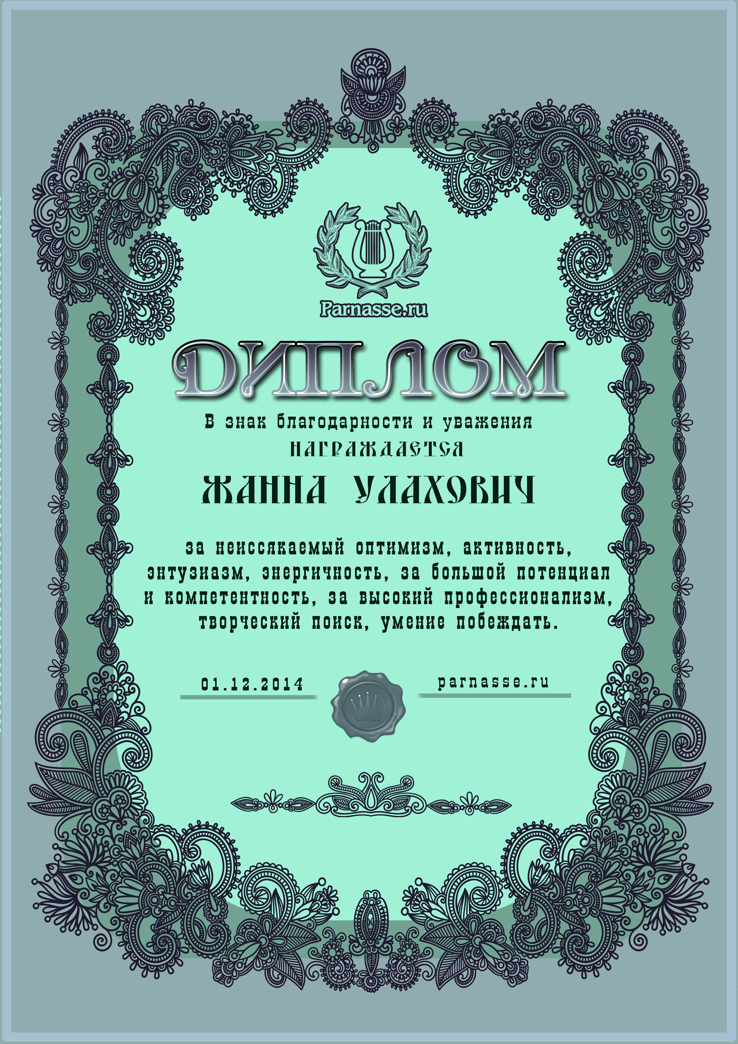 За неугасающую и неисчерпаемую творческую активность, постоянный контакт с Музой и признание сообществом "Парнасцев".От всей души желаем Вам, Жанна, здоровья, любви, успехов, благополучия, удачи и творческого вдохновения!