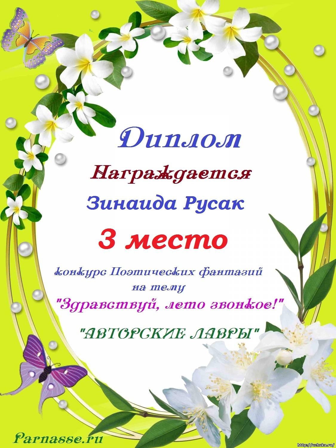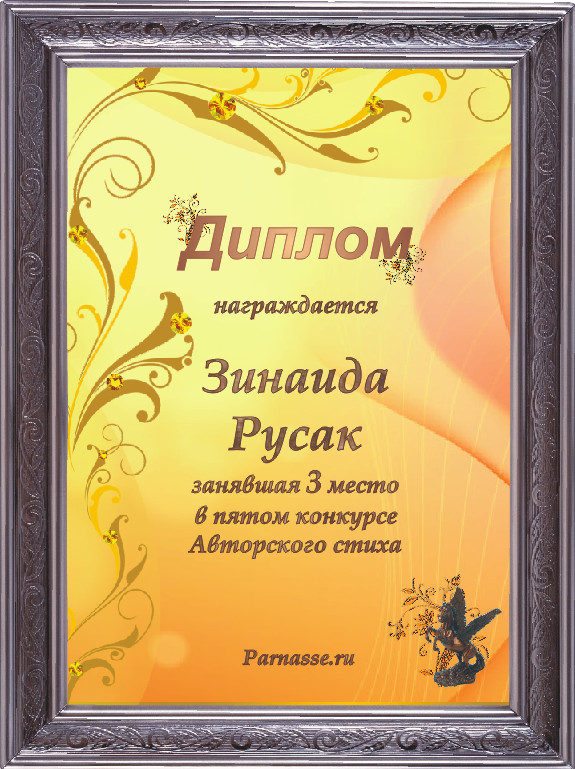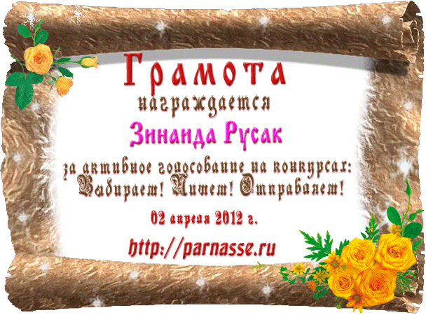 За неугасающую и неисчерпаемую творческую активность, постоянный контакт с Музой и признание сообществом "Парнасцев".От всей души желаем Вам, Зинаида, здоровья, любви, успехов, благополучия, удачи и творческого вдохновения!