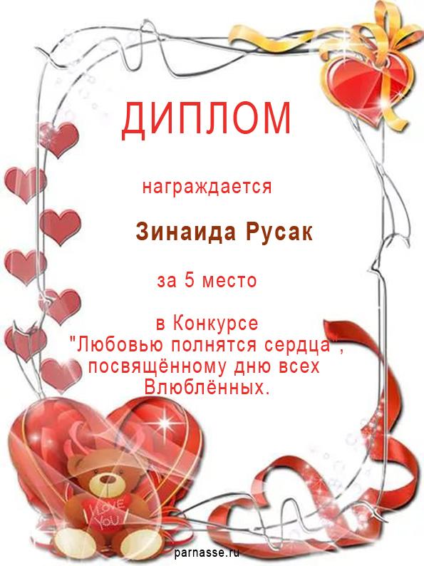 Поздравляю! 5 место в Конкурсе "Любовью полнятся сердца", посвящённому дню всех влюблённых!