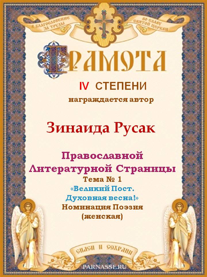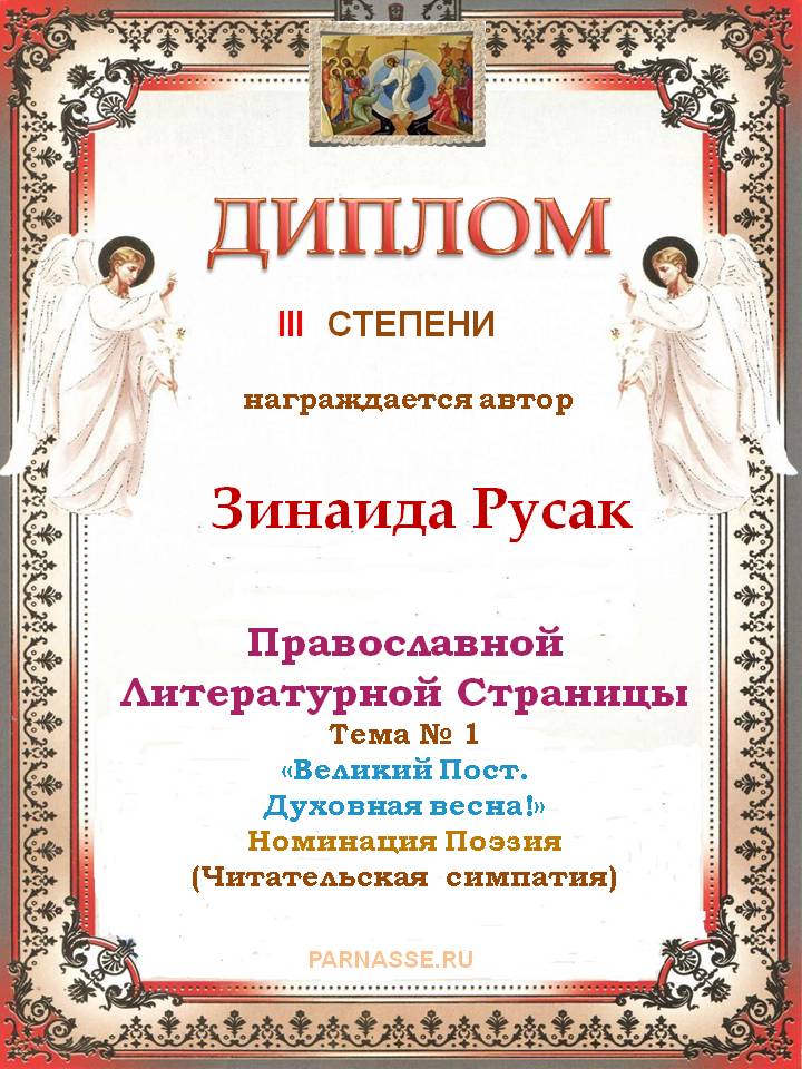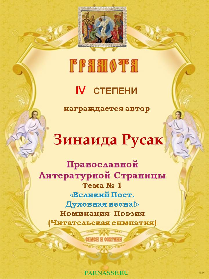 За 4-е место на Православной Литературной Странице, Тема № 1 "Великий Пост. Духовная весна!" Номинация Поэзия. Читательская симпатия.