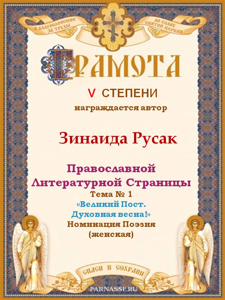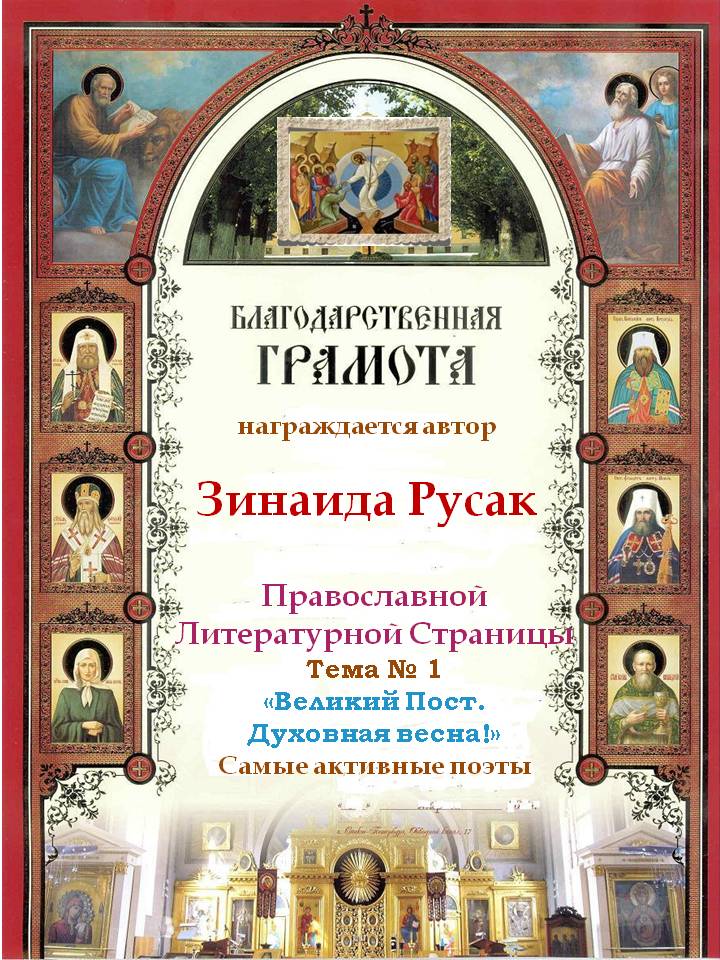За прекрасную победу на Православной Литературной Странице, Тема № 1 "Великий Пост. Духовная весна!"Номинация Поэзия.