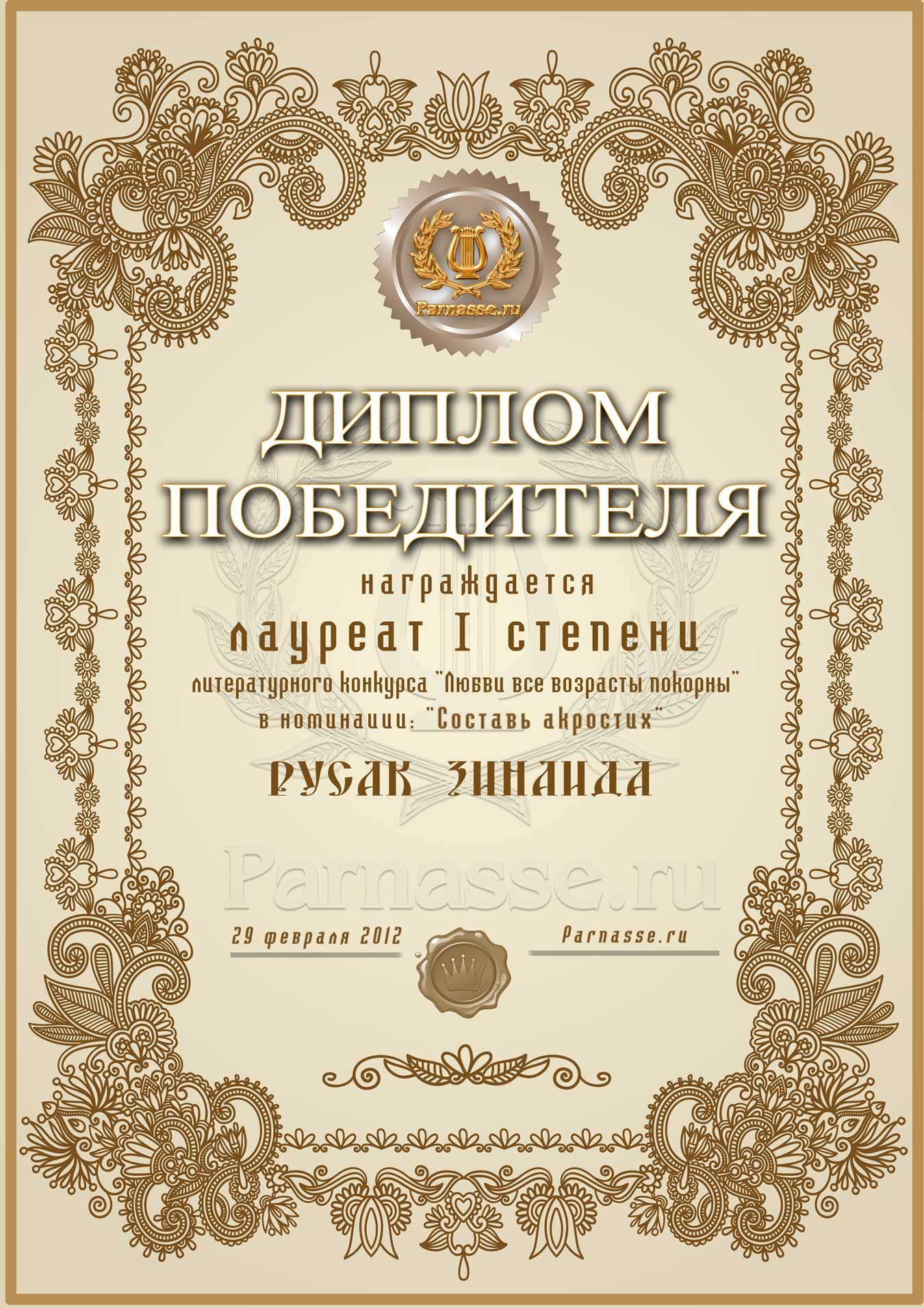 Диплом победителю в конкурсах Акростиха в связи с пятилетием конкурса Акростиха!