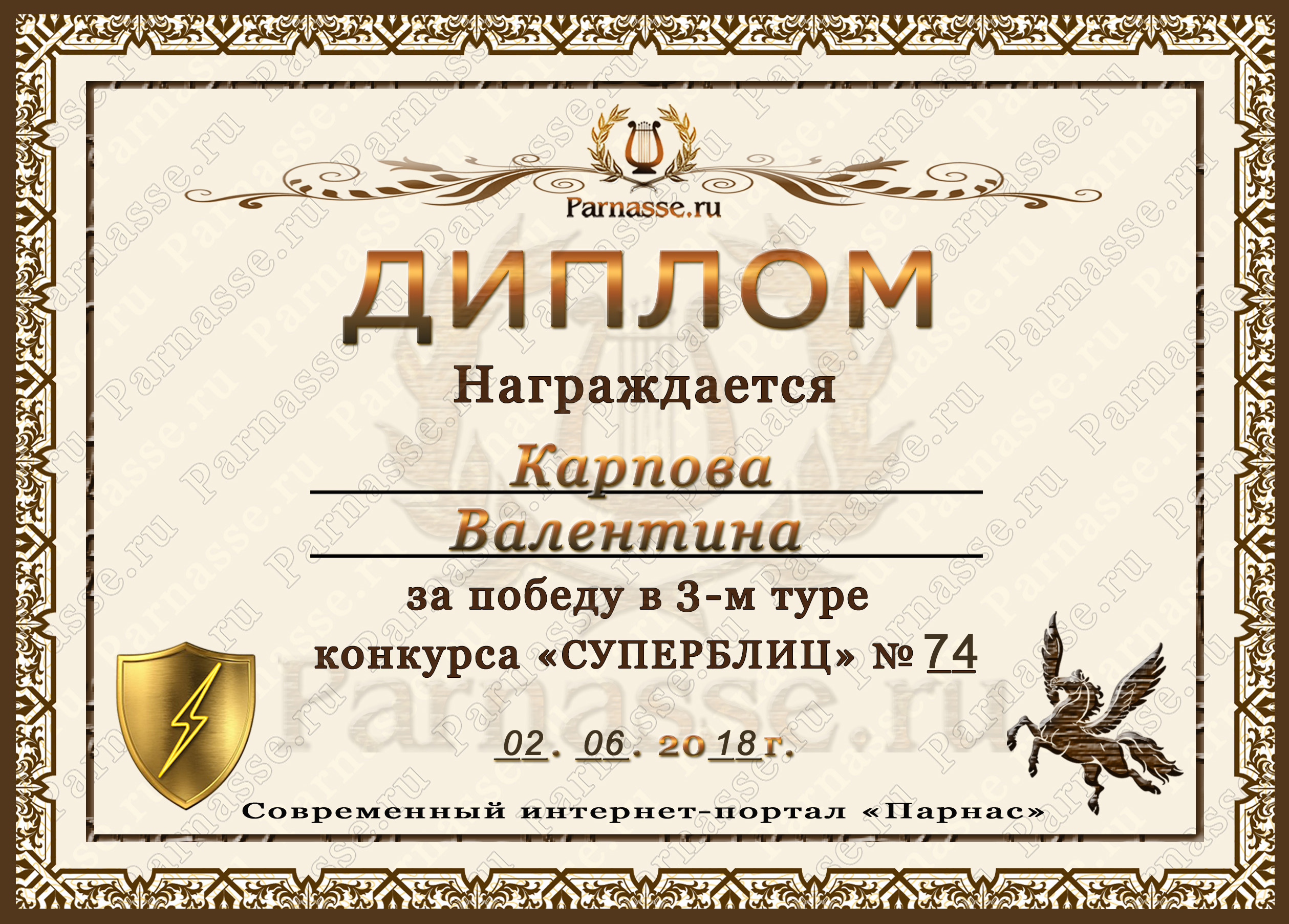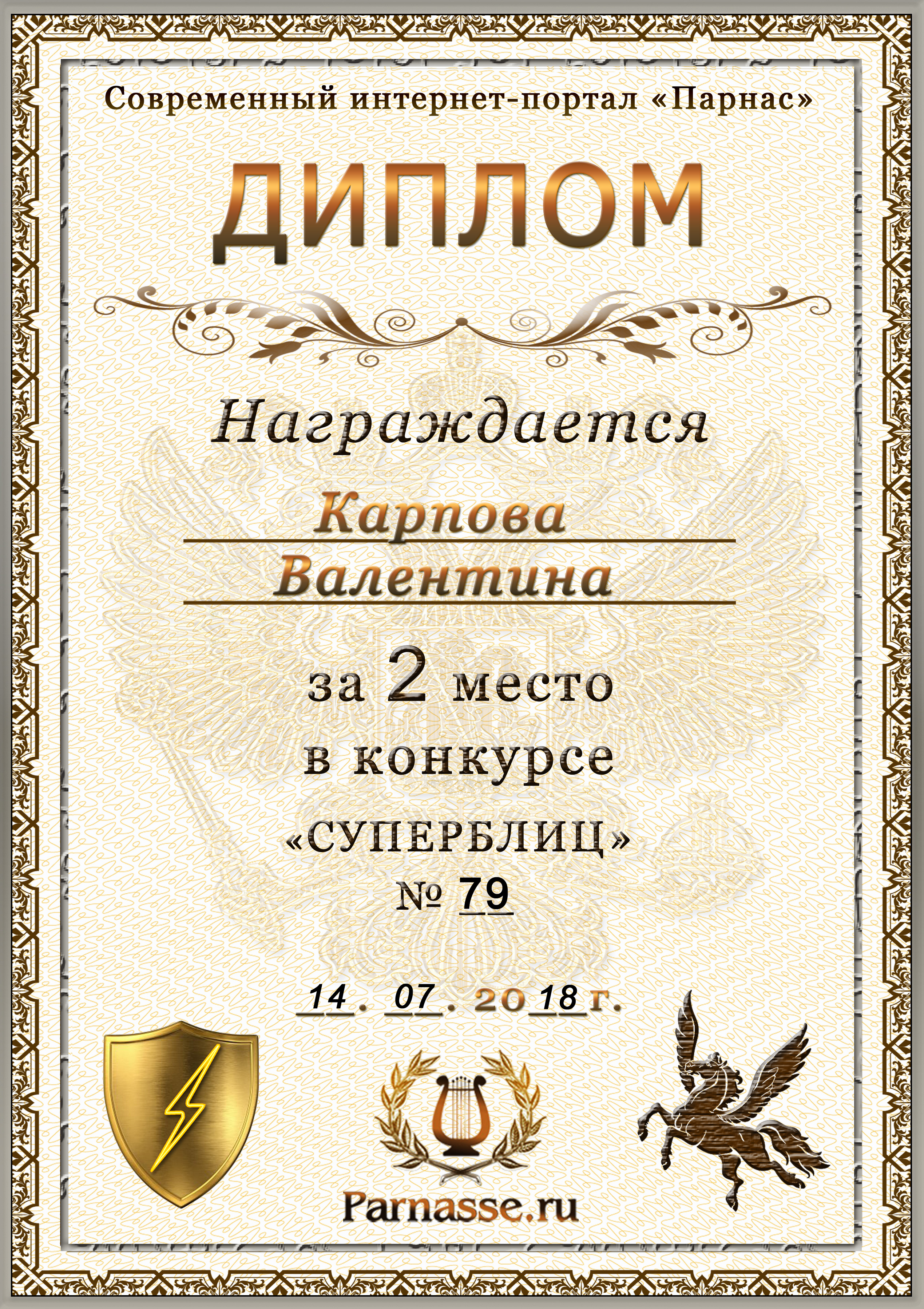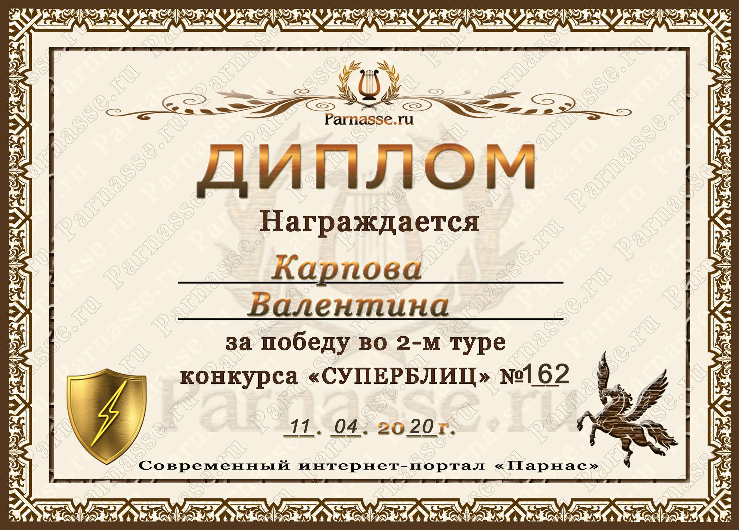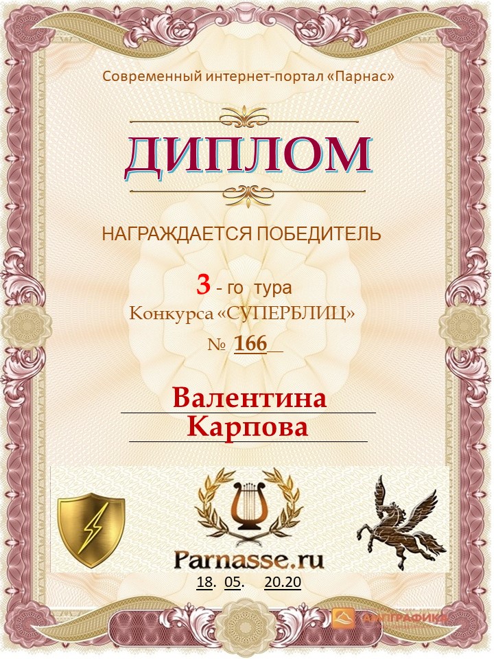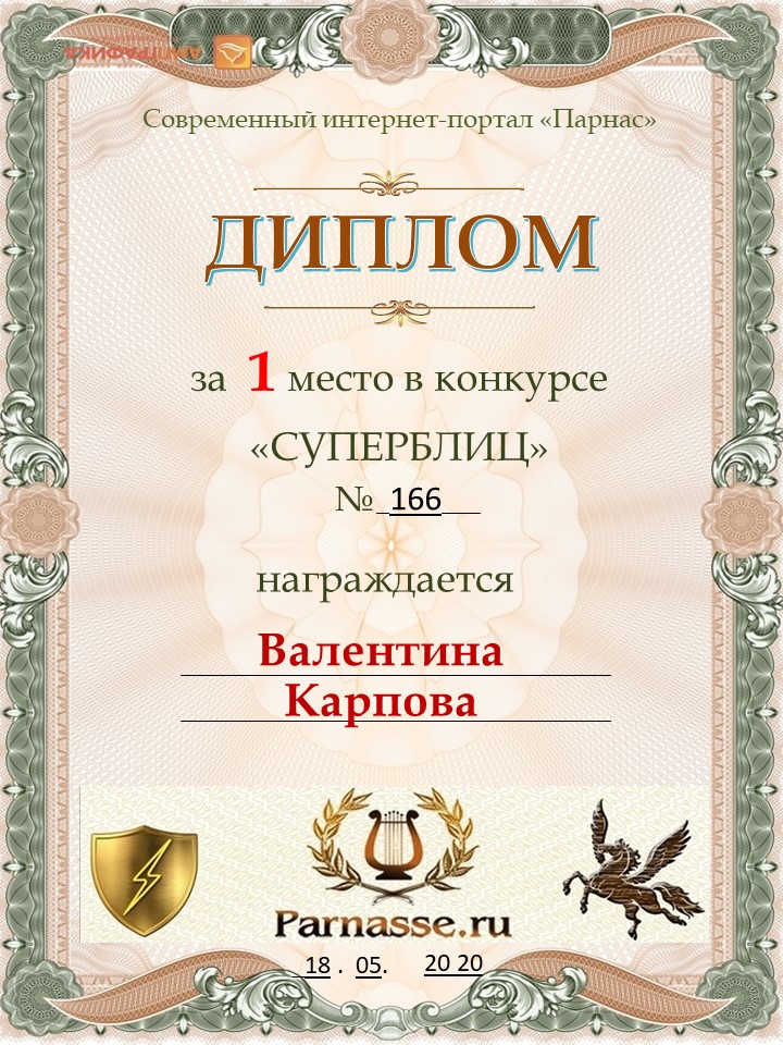 Диплом за победу во 2 туре в конкурсе СУПЕРБЛИЦА № 162! ПОЗДРАВЛЯЮ!