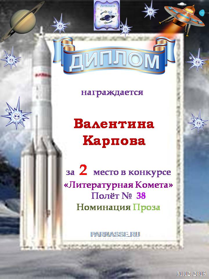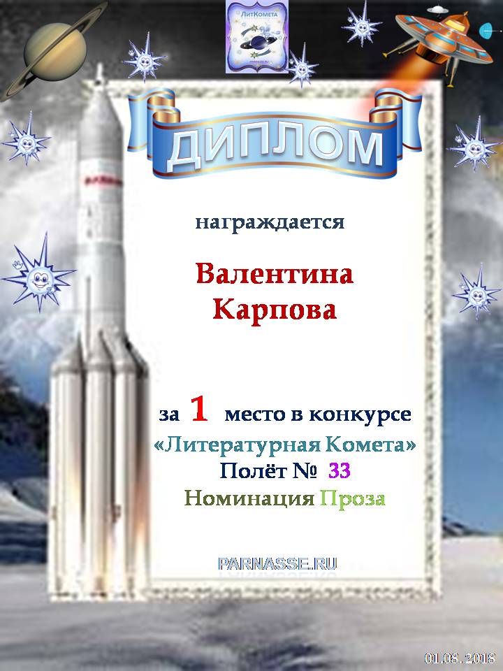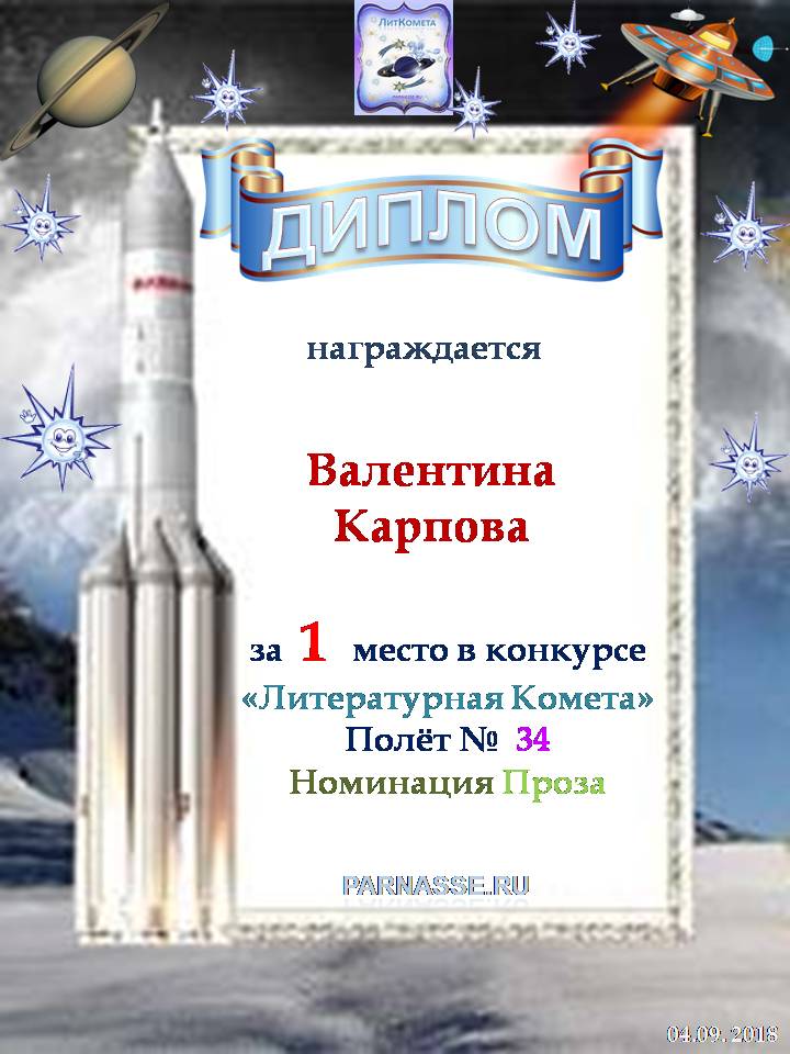 Поздравляю с занятым 1 местом в конкурсе «Литературная Комета – Полёт № 34» - номинация проза
