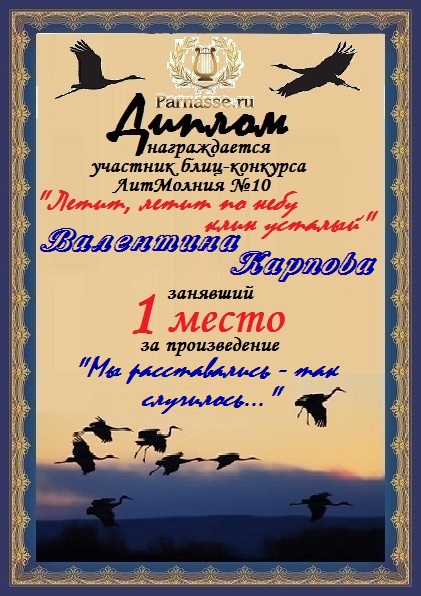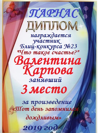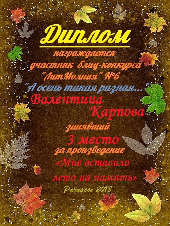 Поздравляем с занятым 3 местом в ЛИТКОНКУРСе «Золотом рассыпался сентябрь.,,», номинация – Проза (судейское голосование)!