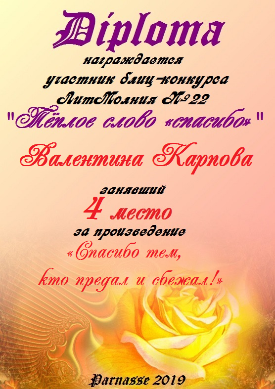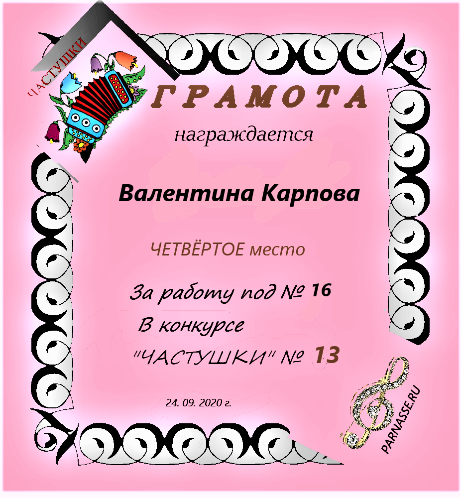 Грамота за 4 место в 142 конкурсе АКРОСТИХА (Альтернатива)! ПОЗДРАВЛЯЮ!