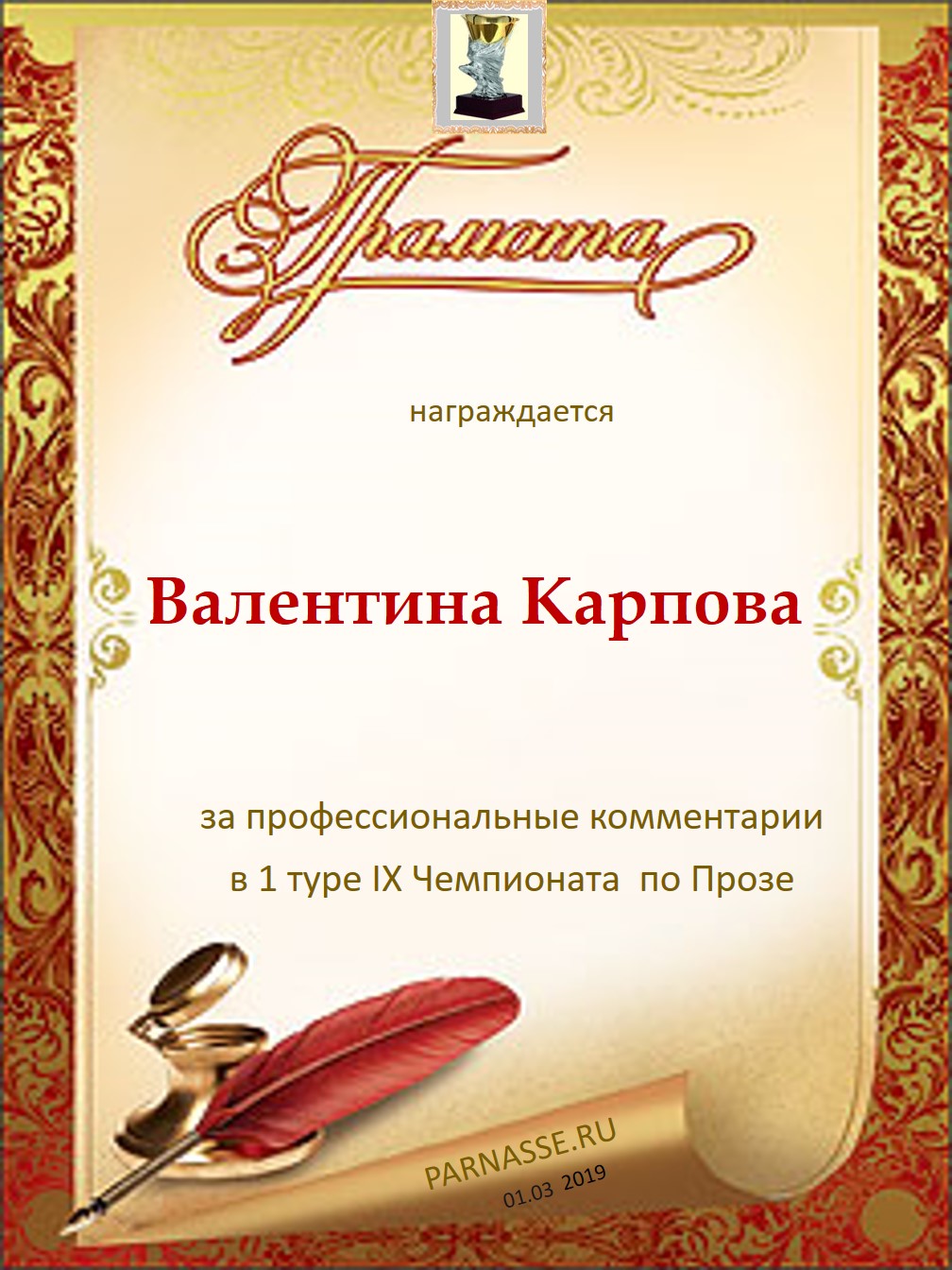 Большое спасибо за профессиональные и объективные комментарии в 1 туре X Чемпионата Парнаса по Прозе!