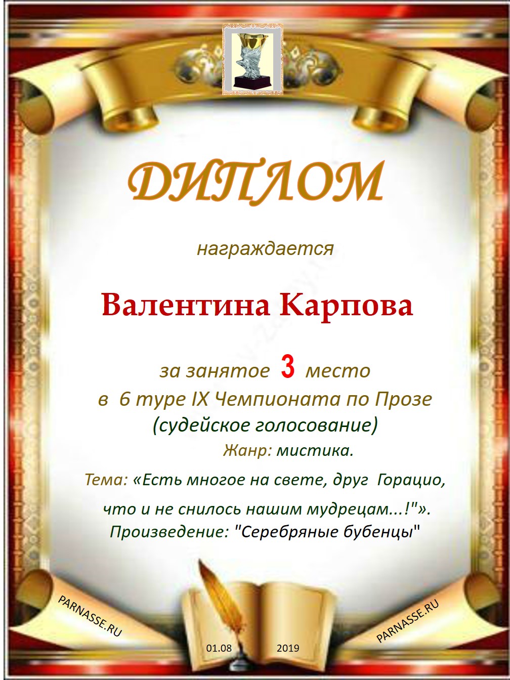 Поздравляю с занятым 3 местом в IX Чемпионате Парнаса по прозе – 6 тур (судейское голосование)