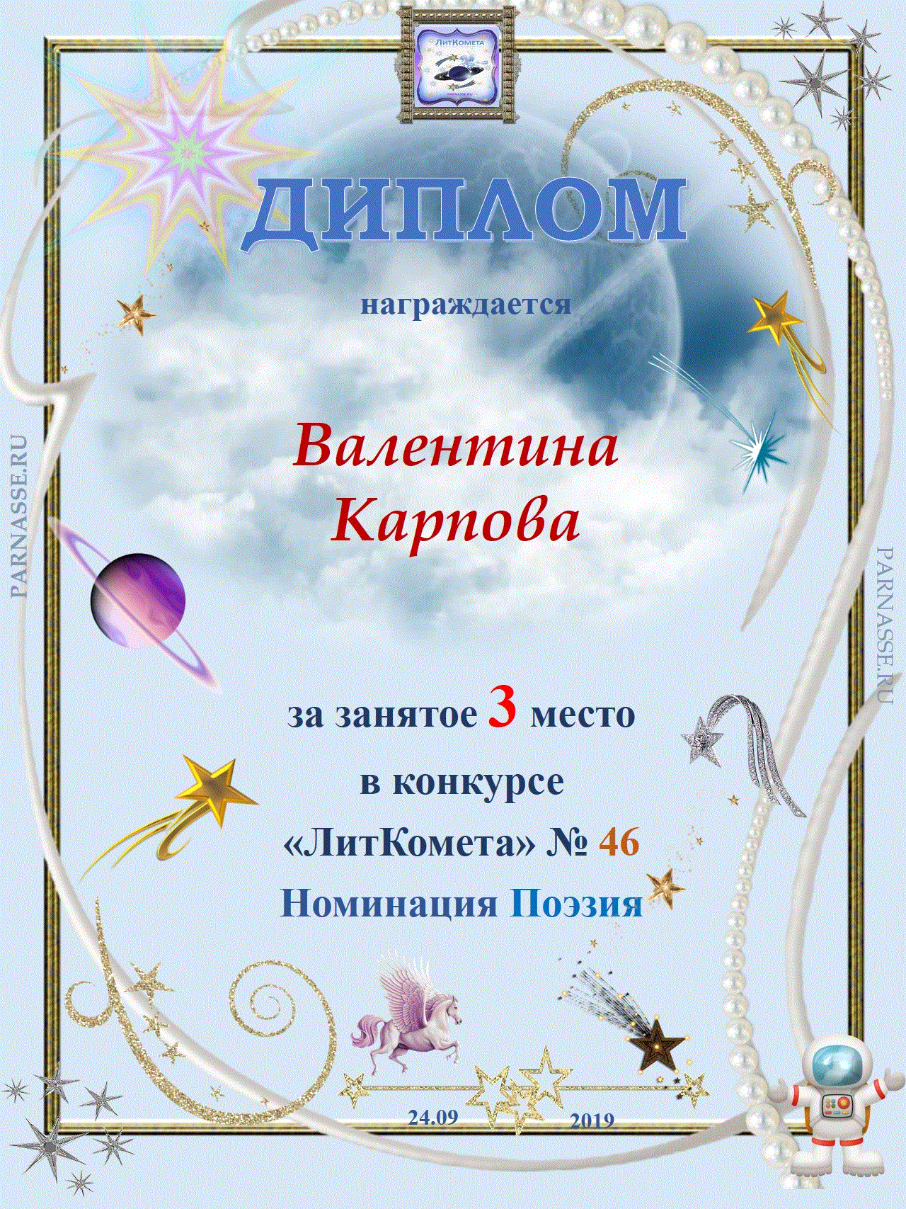 Поздравляю с занятым 3 местом в конкурсе "Литературная Комета - Полёт № 50" - Номинация Поэзия!