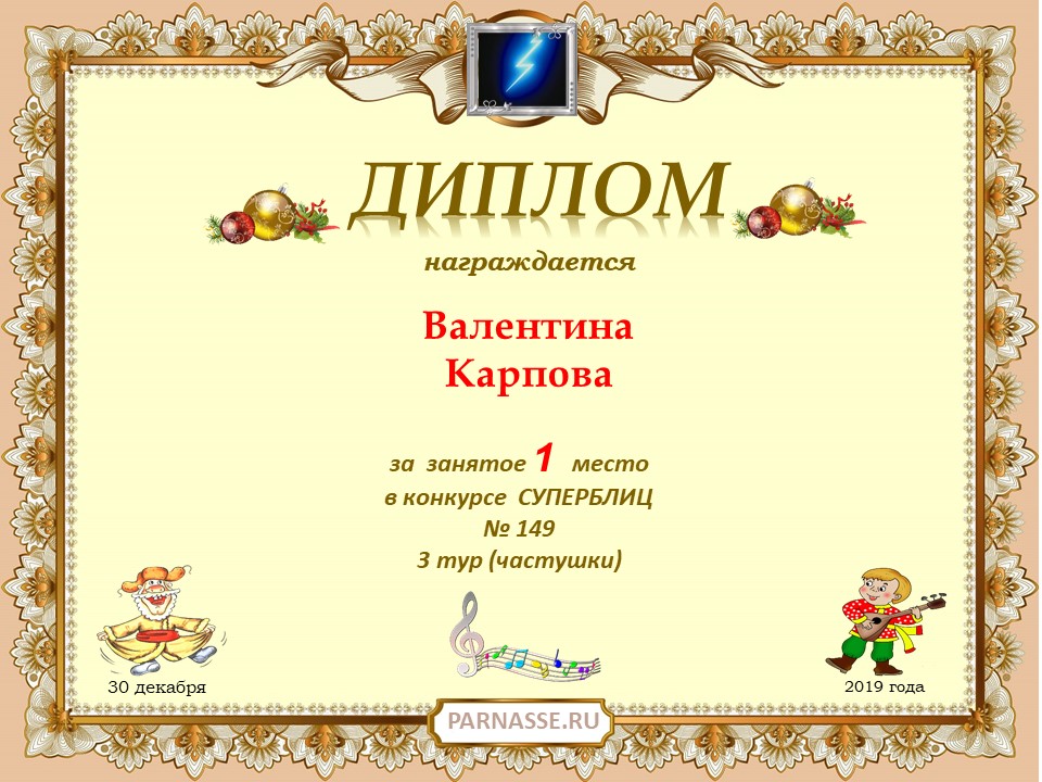 Диплом за 1 место в 3 туре (частушки) 149 конкурса СУПЕРБЛИЦА! ПОЗДРАВЛЯЮ!