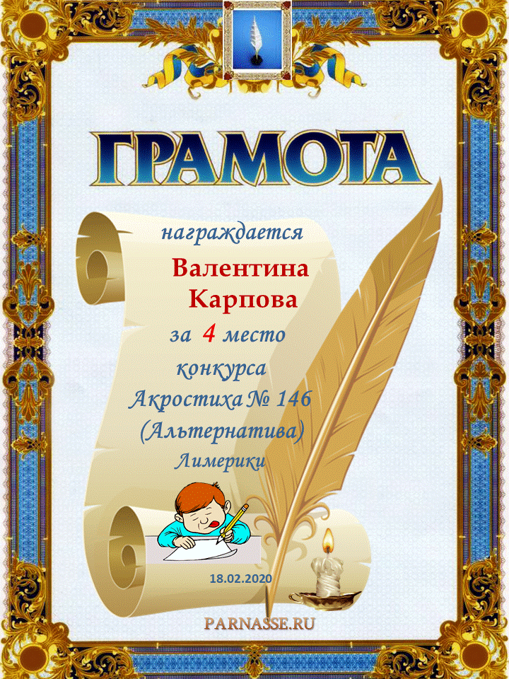 Грамота за 4 место в 146 конкурсе АКРОСТИХА (Альтернатива)! ПОЗДРАВЛЯЮ!