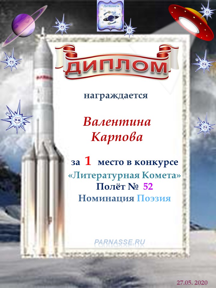 Поздравляю с занятым 1 местом в конкурсе "Литературная Комета - Полёт № 52" - Номинация Поэзия!