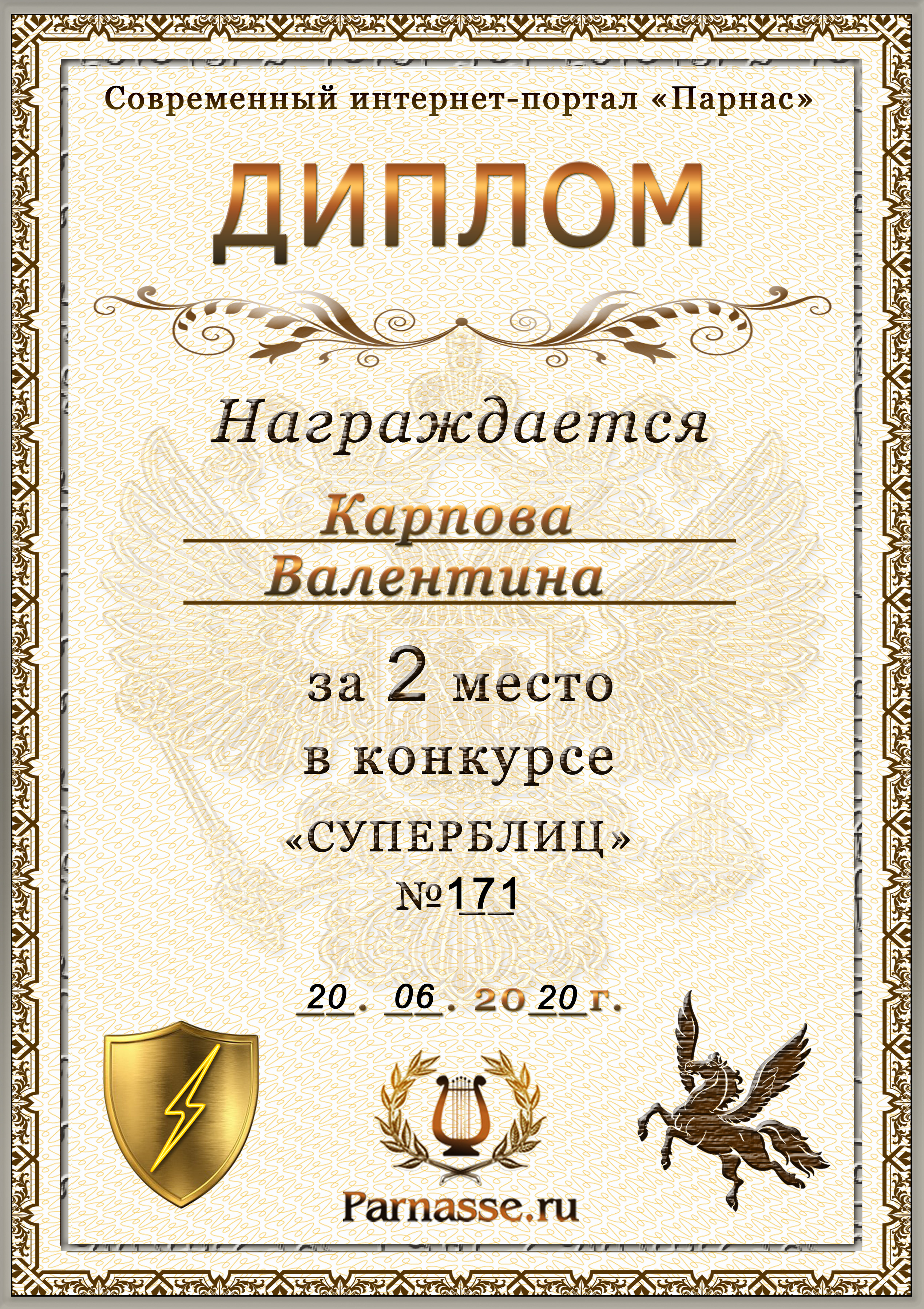 Диплом за победу во 2 туре в конкурсе СУПЕРБЛИЦА № 171! ПОЗДРАВЛЯЮ!