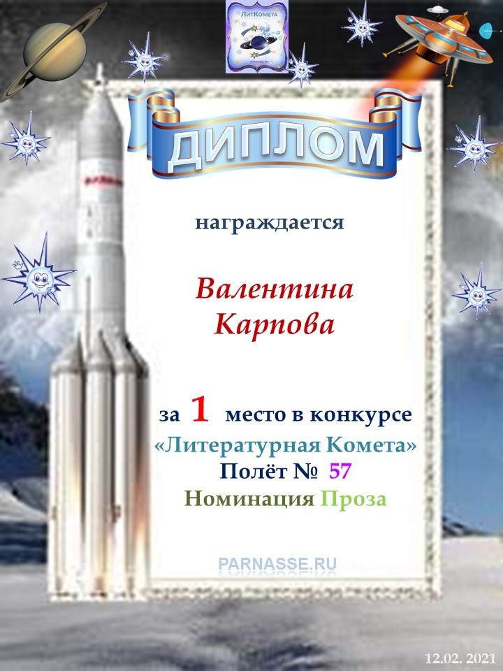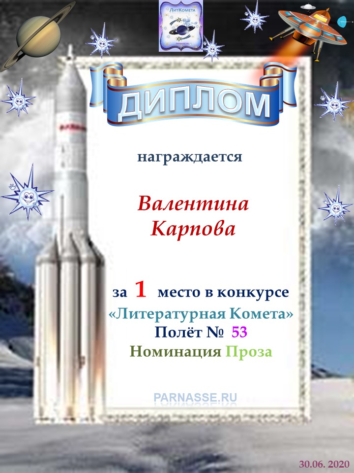 Поздравляю с занятым 1 местом в конкурсе “Литературная Комета – Полёт № 45» - Номинация Проза!