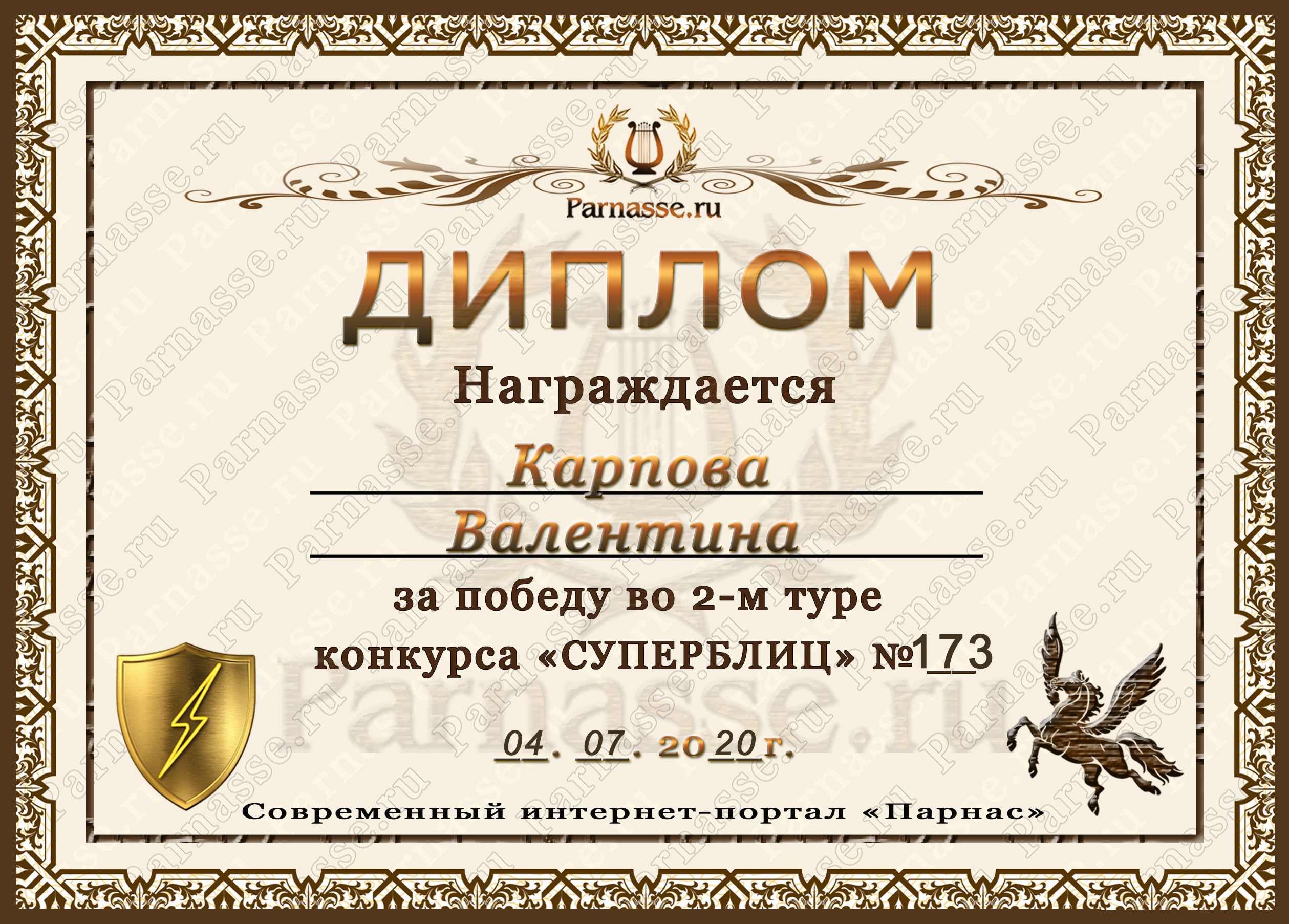Диплом за победу во 2 туре в конкурсе СУПЕРБЛИЦА № 173! ПОЗДРАВЛЯЮ!