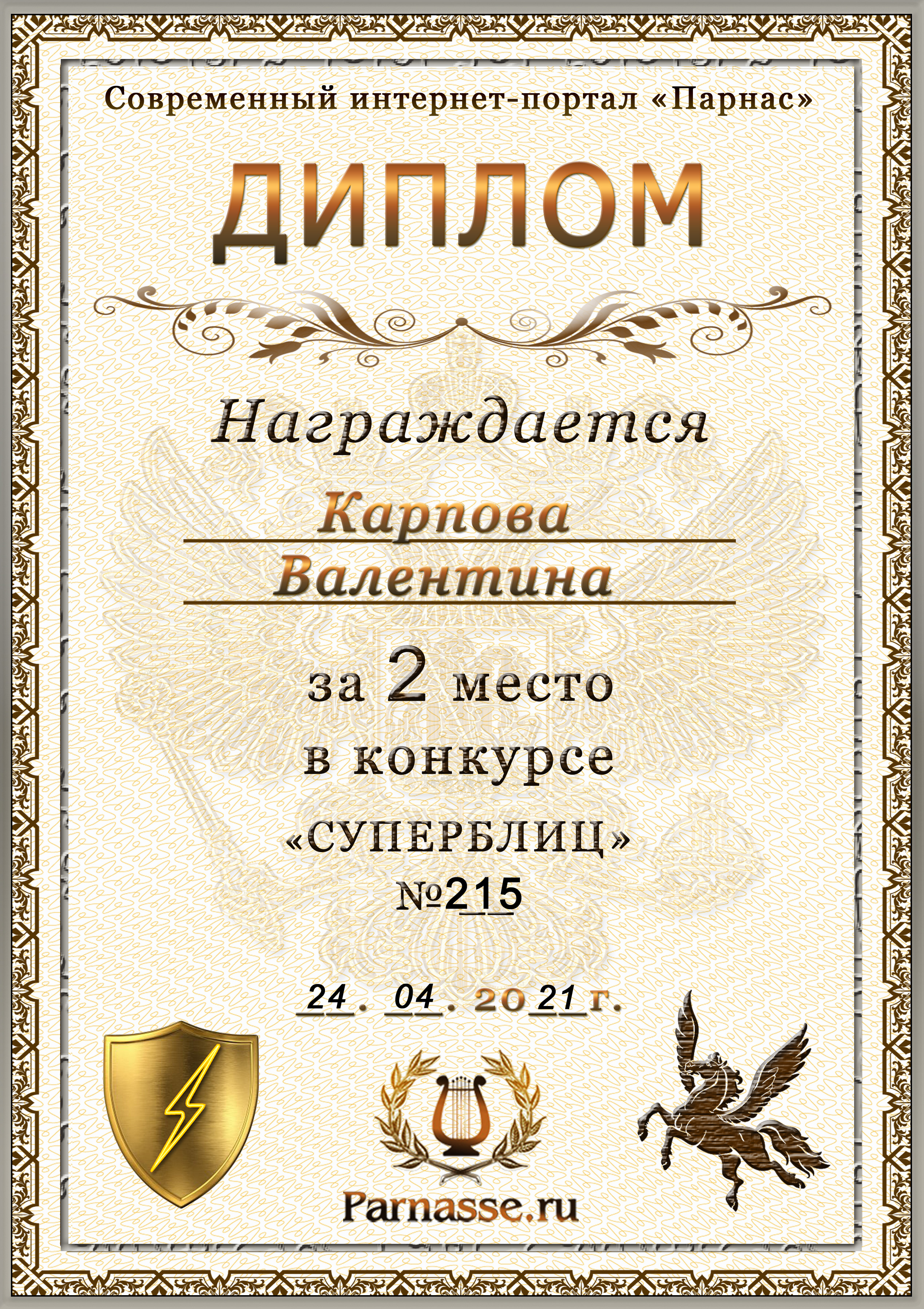 Диплом за победу во 2 туре в конкурсе СУПЕРБЛИЦА № 126! ПОЗДРАВЛЯЮ!