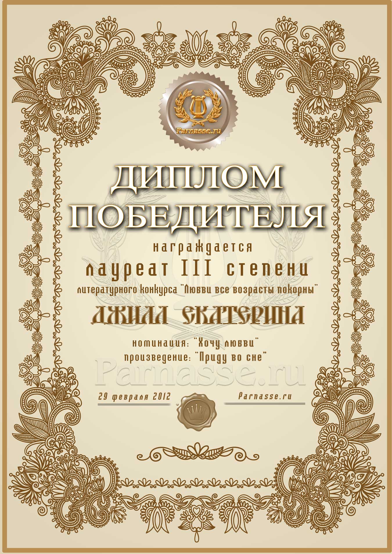 Диплом лауреата III степени лит.конкурса "Любви все возрасты покорны"