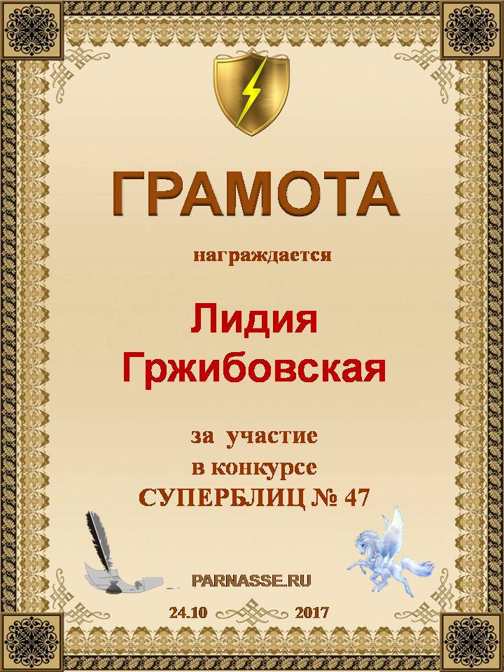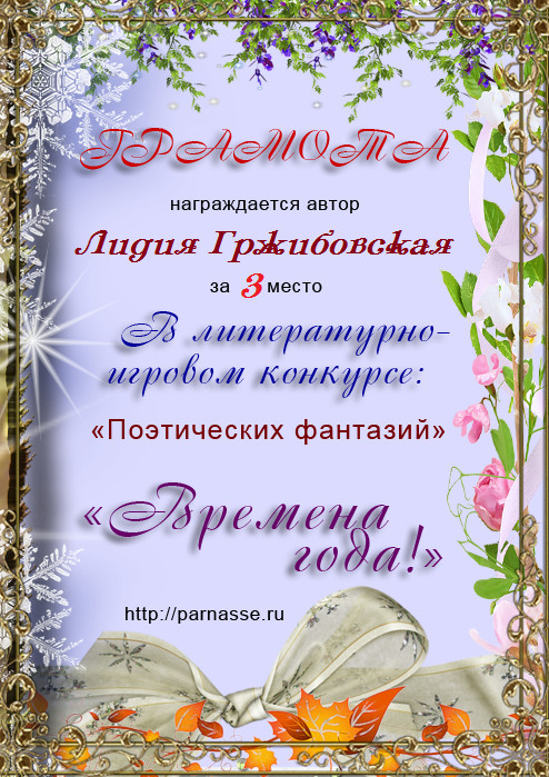 За неугасающую и неисчерпаемую творческую активность, постоянный контакт с Музой и признание сообществом "Парнасцев".От всей души желаем Вам, Лидия, здоровья, любви, успехов, благополучия, удачи и творческого вдохновения!