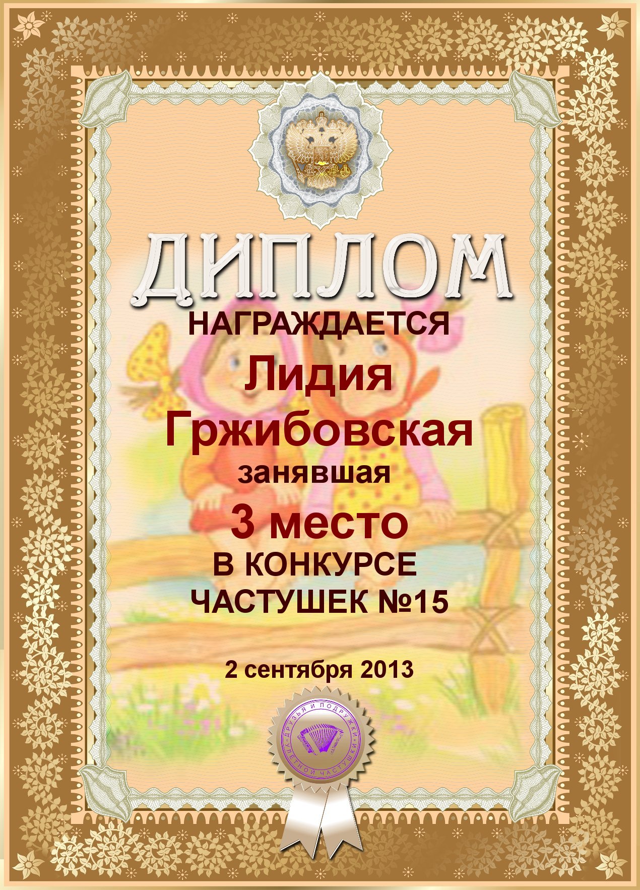 Диплом лауреата II степени сетевого лит. конкурса "Любви все возрасты покорны" в номинации "Частушки", (Общее голосование).