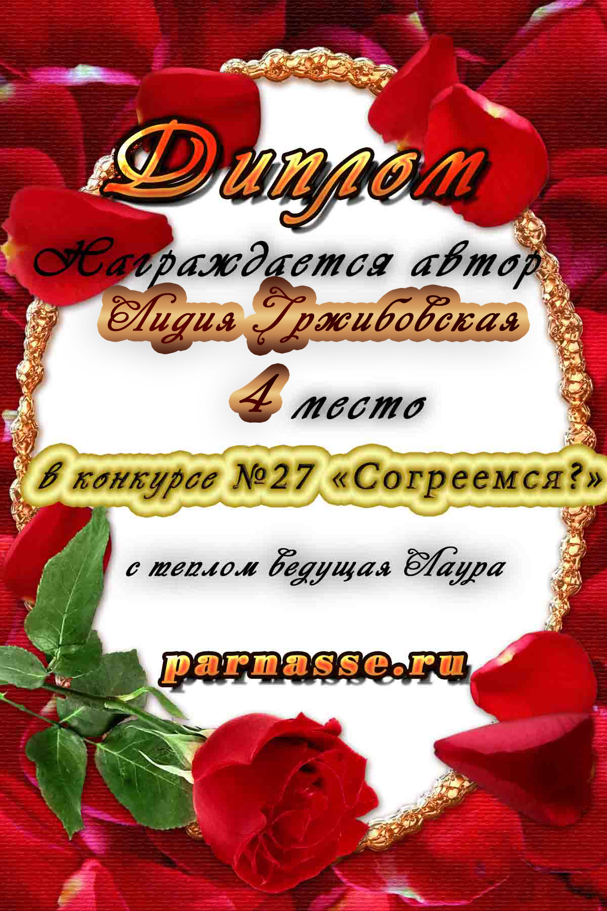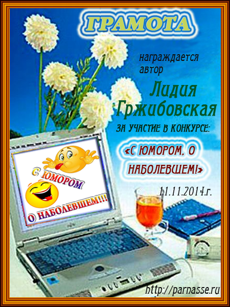 Диплом вручается от лица всех администраторов сайта, всех модераторов и всех ведущих конкурсов в знак благодарности и за помощь по всем вопросам! За огромный вклад в развитие Парнаса! За безупречное ведение конкурсов! Огромное спасибо добрейшему человеку на Парнасе!Спасибо, Лидия!