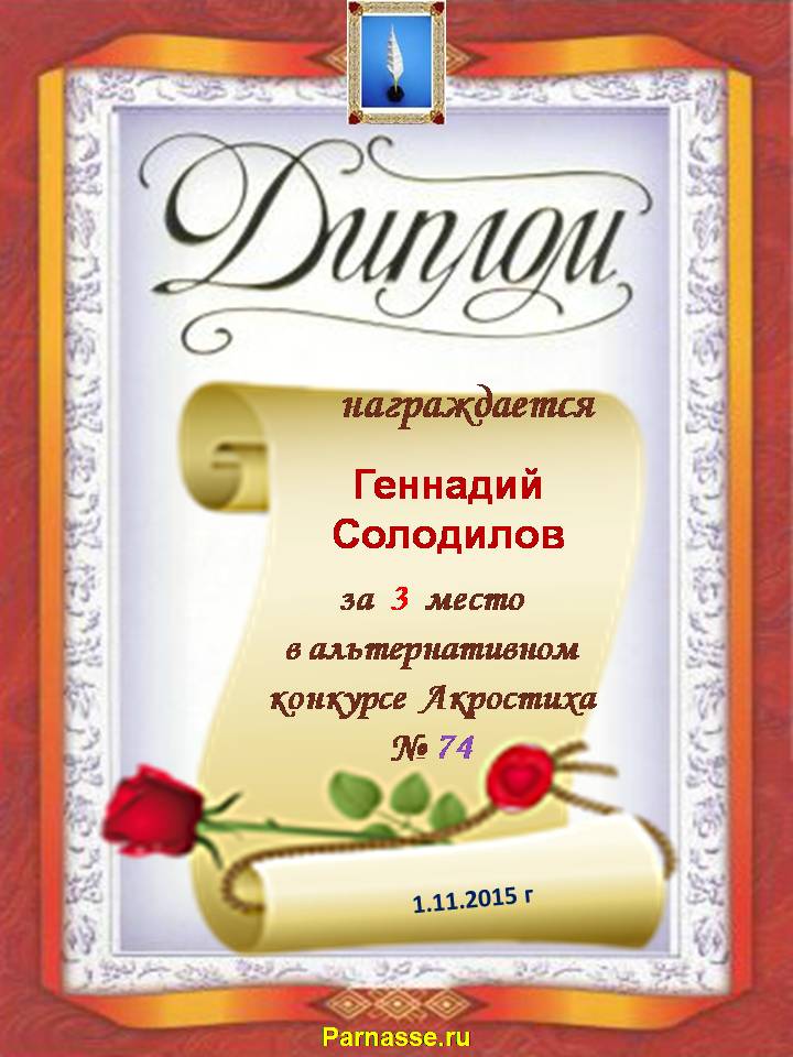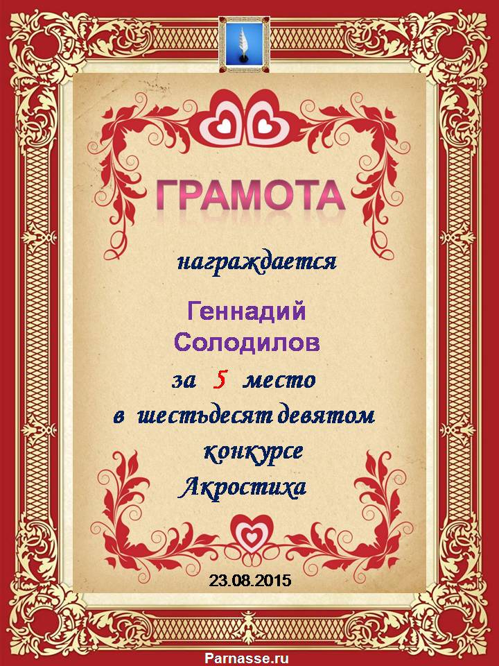 Грамота за 5 место в 107 конкурсе АКРОСТИХА (Альтернатива)! ПОЗДРАВЛЯЮ!