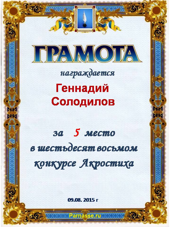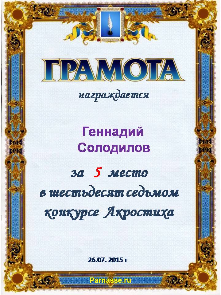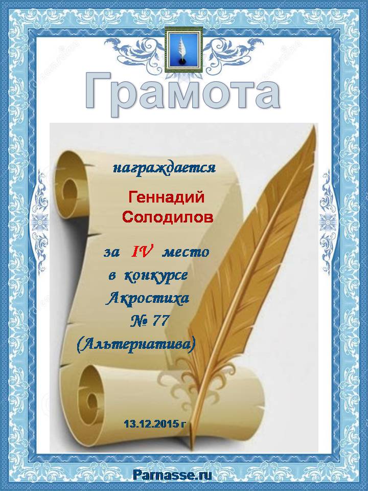 Грамота за четырехкратное 5 место в 96 конкурсе АКРОСТИХА (Альтернатива)! ПОЗДРАВЛЯЮ!